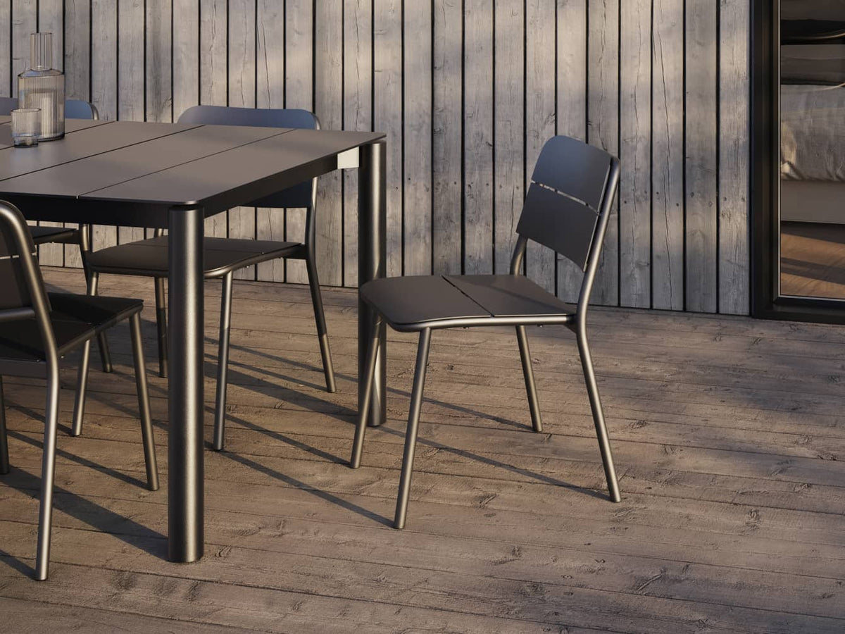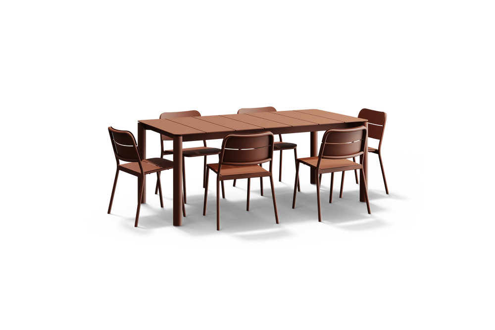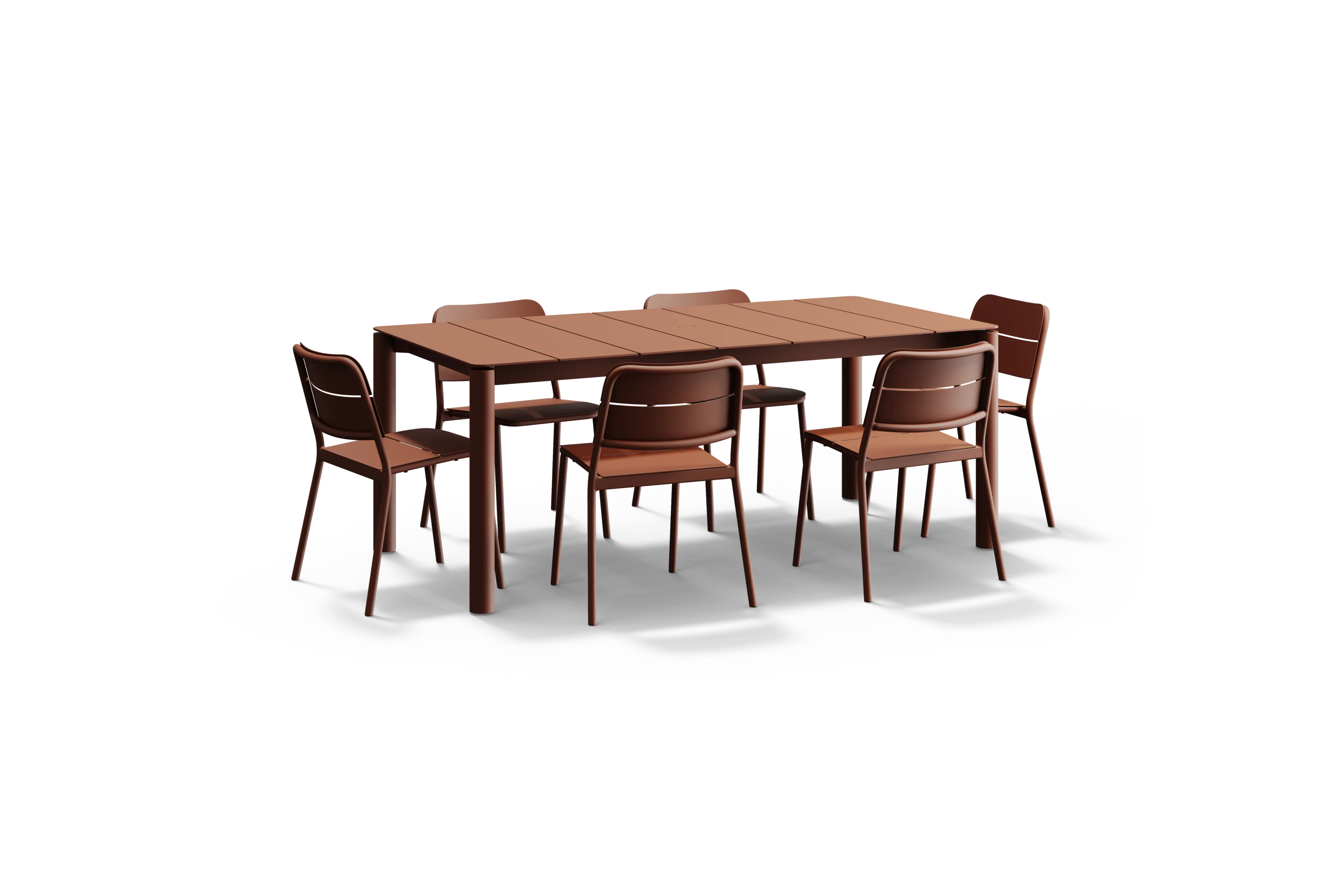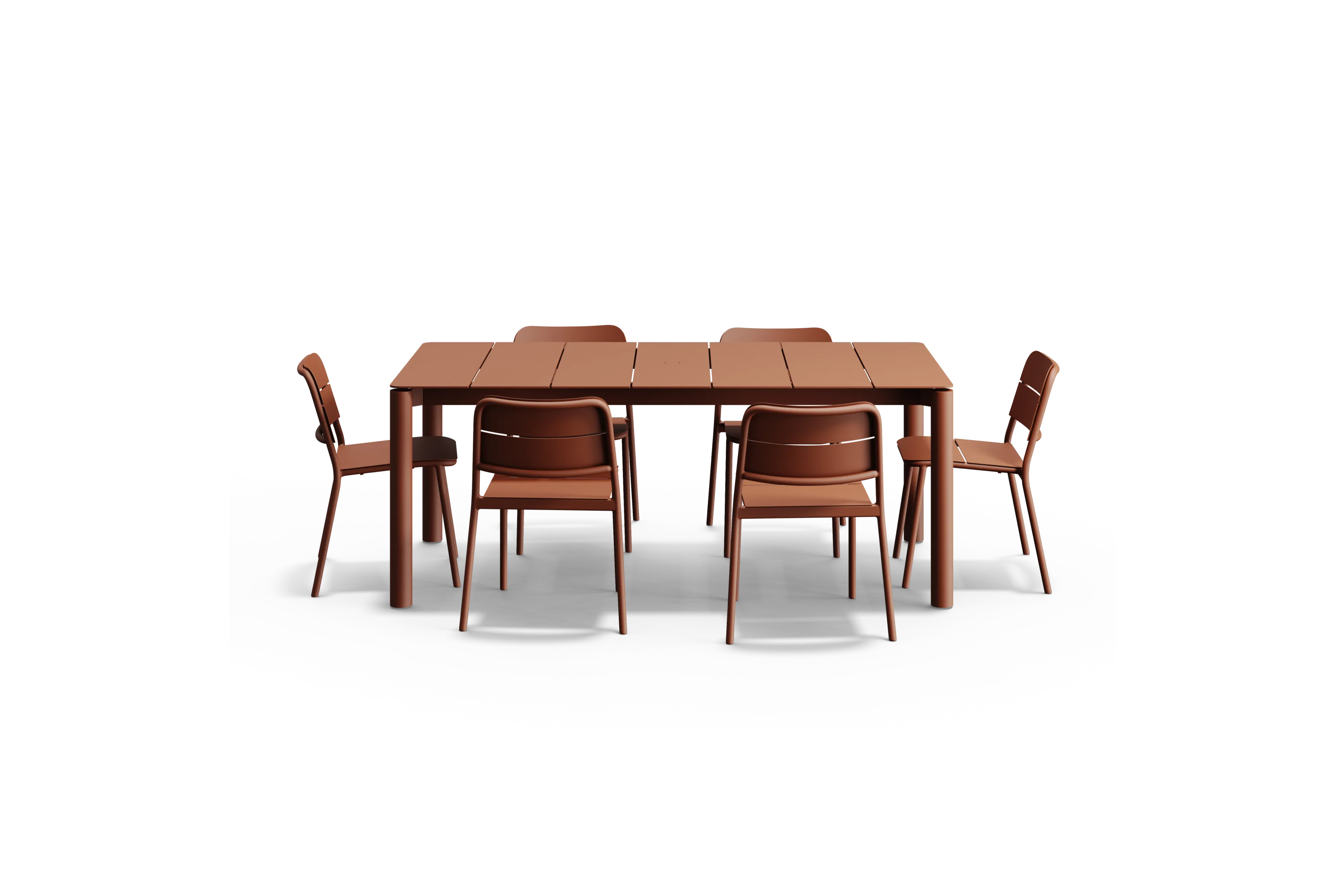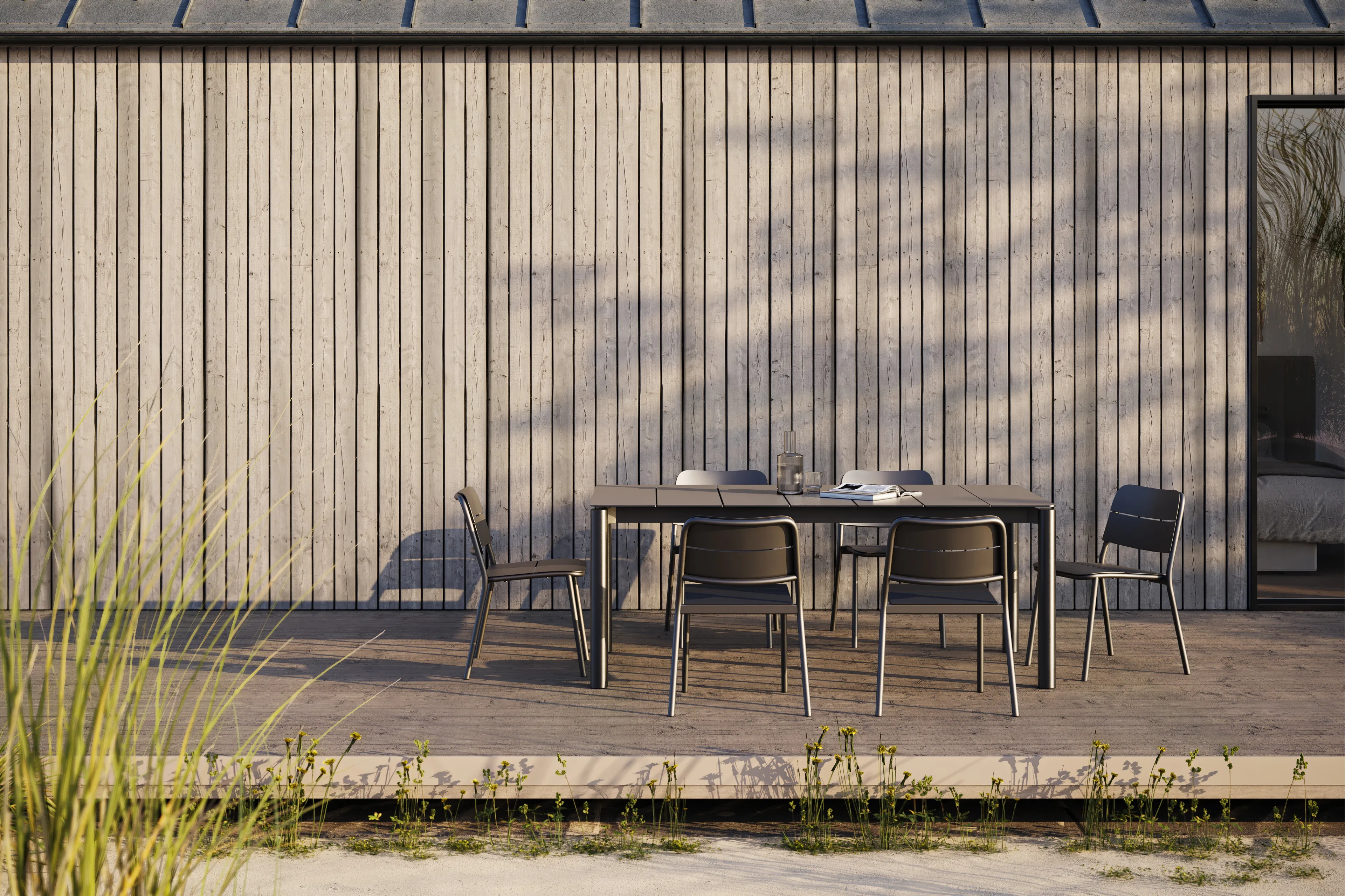 Clean lines, every day ease. The Bandwidth Outdoor Dining Set features a slatted aluminum table surface with stainless steel legs. It comes with six stackable chairs, all powder-coated for durability in a matte finish. Designed for broad appeal and built for the outdoors, it drains easily, assembles quickly, and comfortably seats six (with room to accommodate two more). Available in three versatile colors.