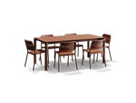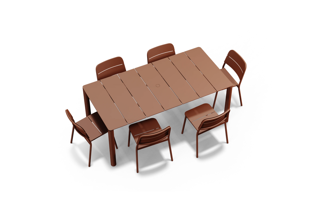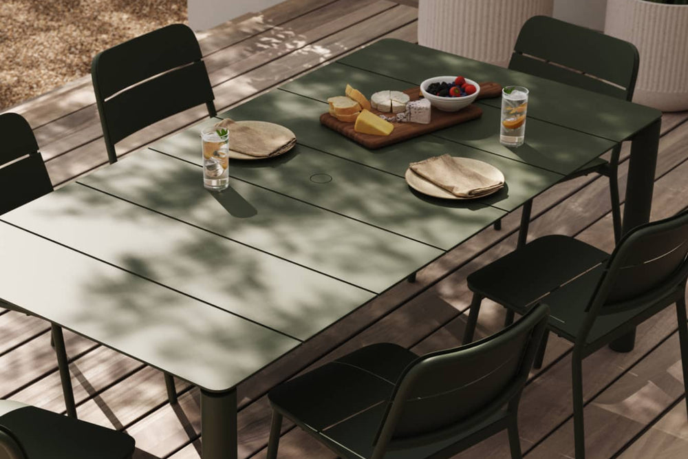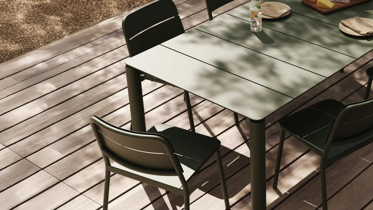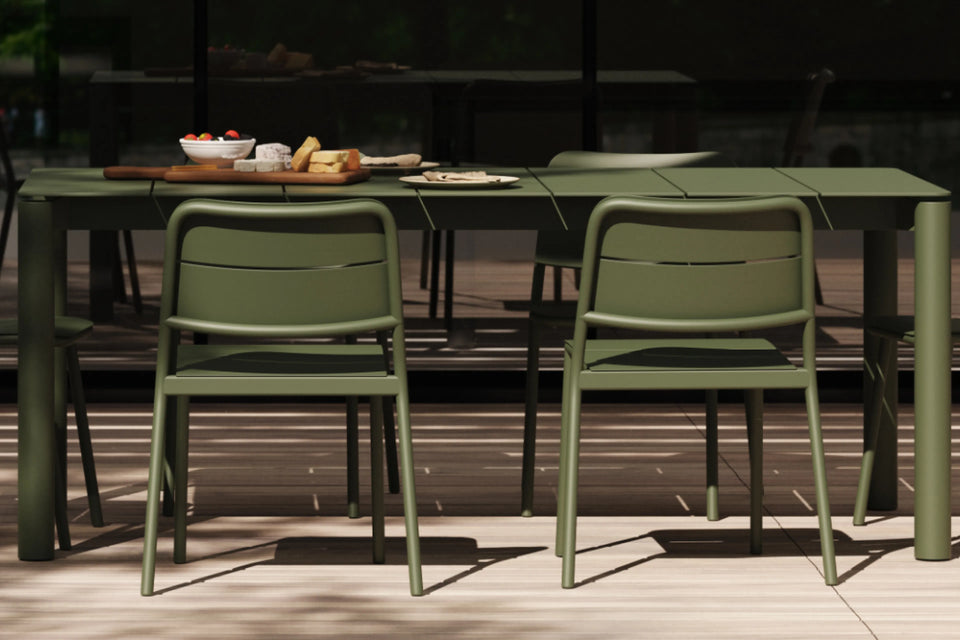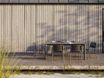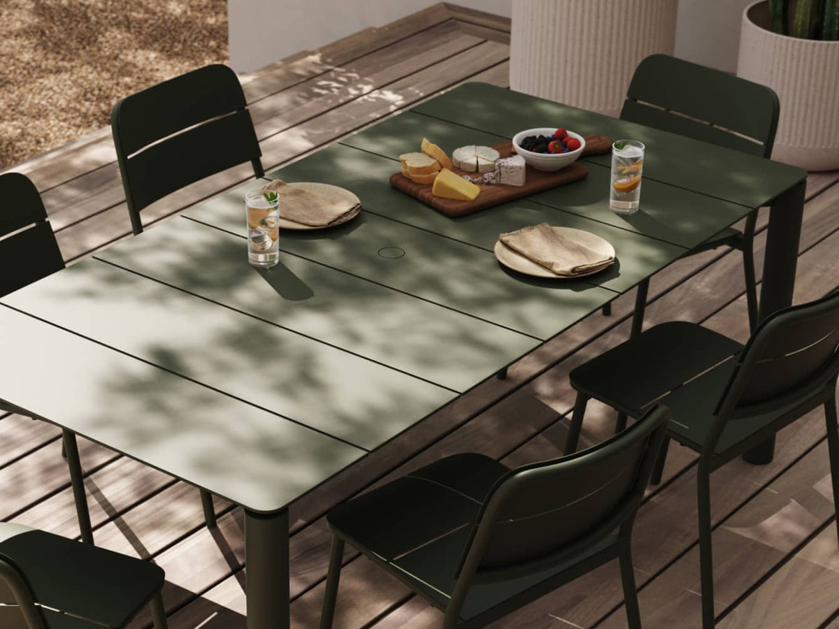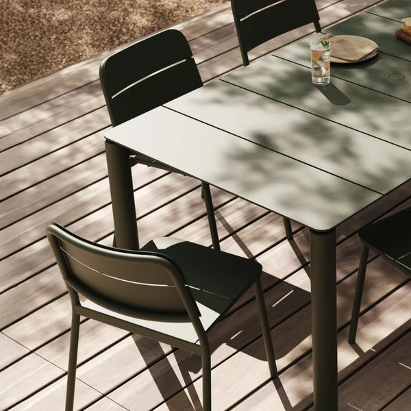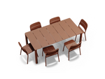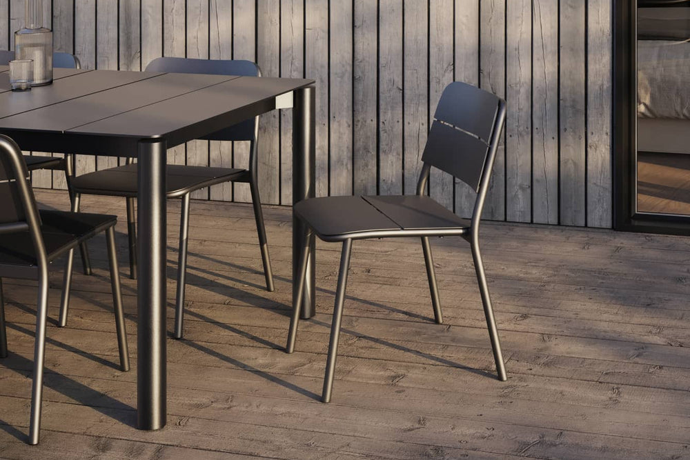 Clean lines, every day ease. The Bandwidth Outdoor Dining Set features a slatted aluminum table surface with stainless steel legs. It comes with six stackable chairs, all powder-coated for durability in a matte finish. Designed for broad appeal and built for the outdoors, it drains easily, assembles quickly, and comfortably seats six (with room to accommodate two more). Available in three versatile colors.