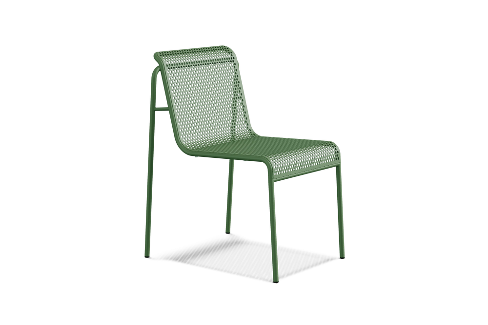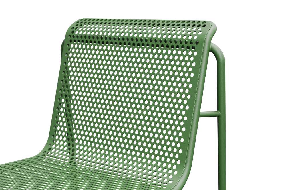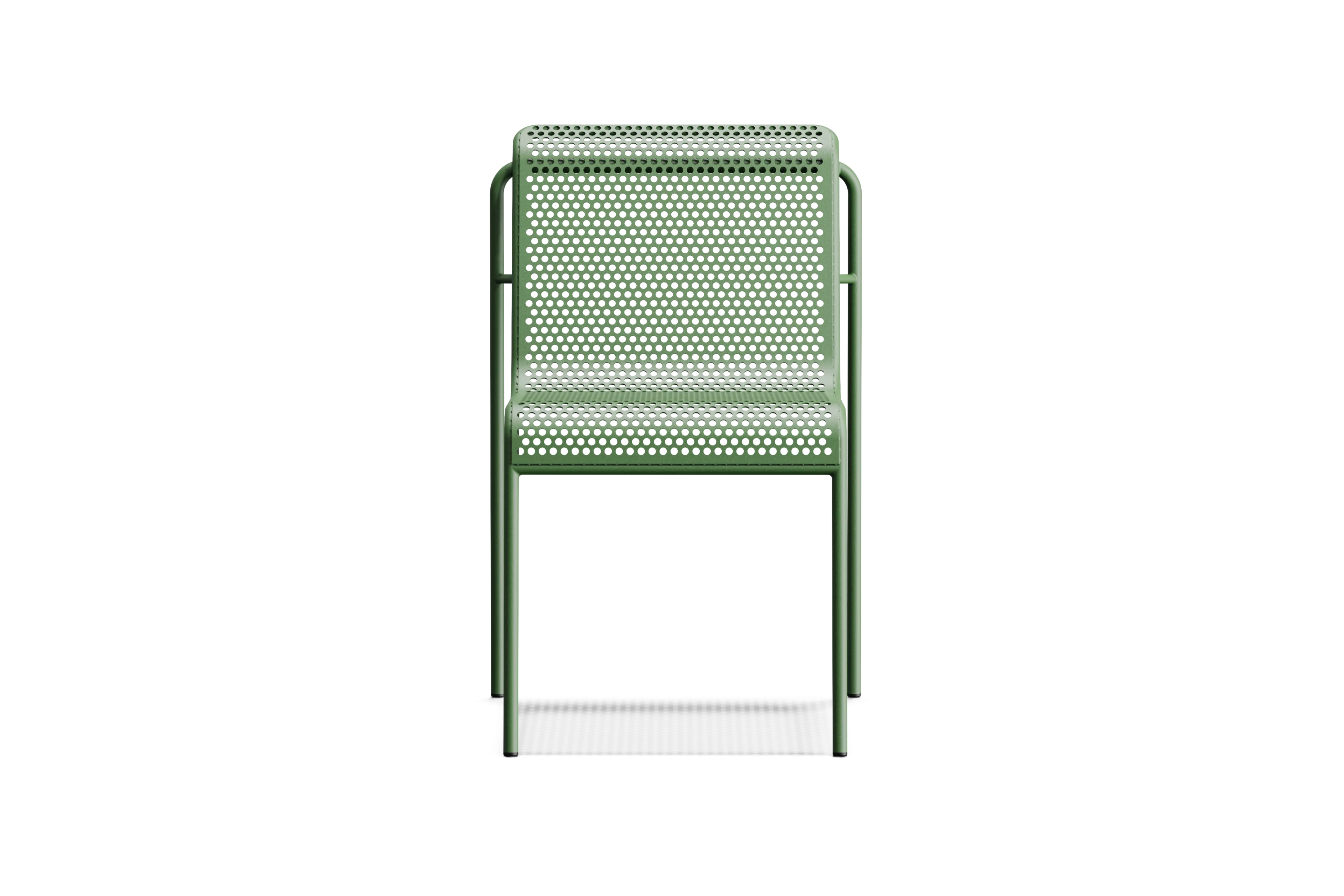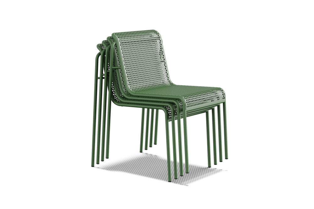 A chair reduced to its essentials: perforated surfaces, softened structure, and nothing extraneous. Stackable. Durable. Designed to hold its own place at the table.