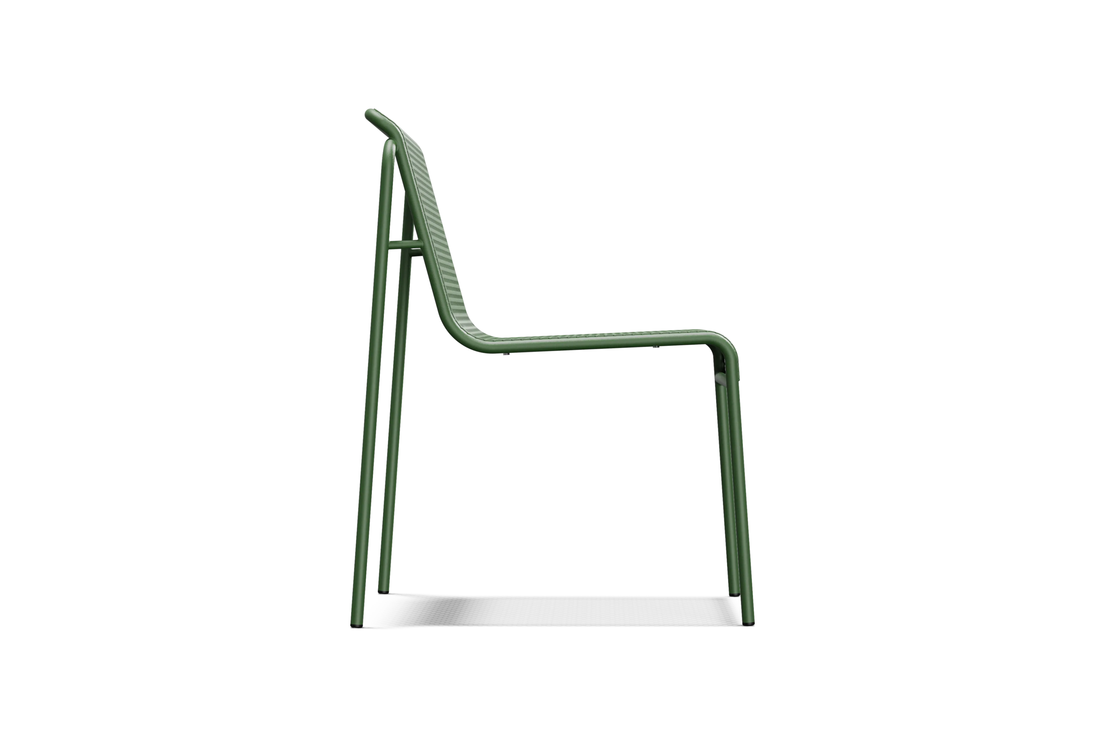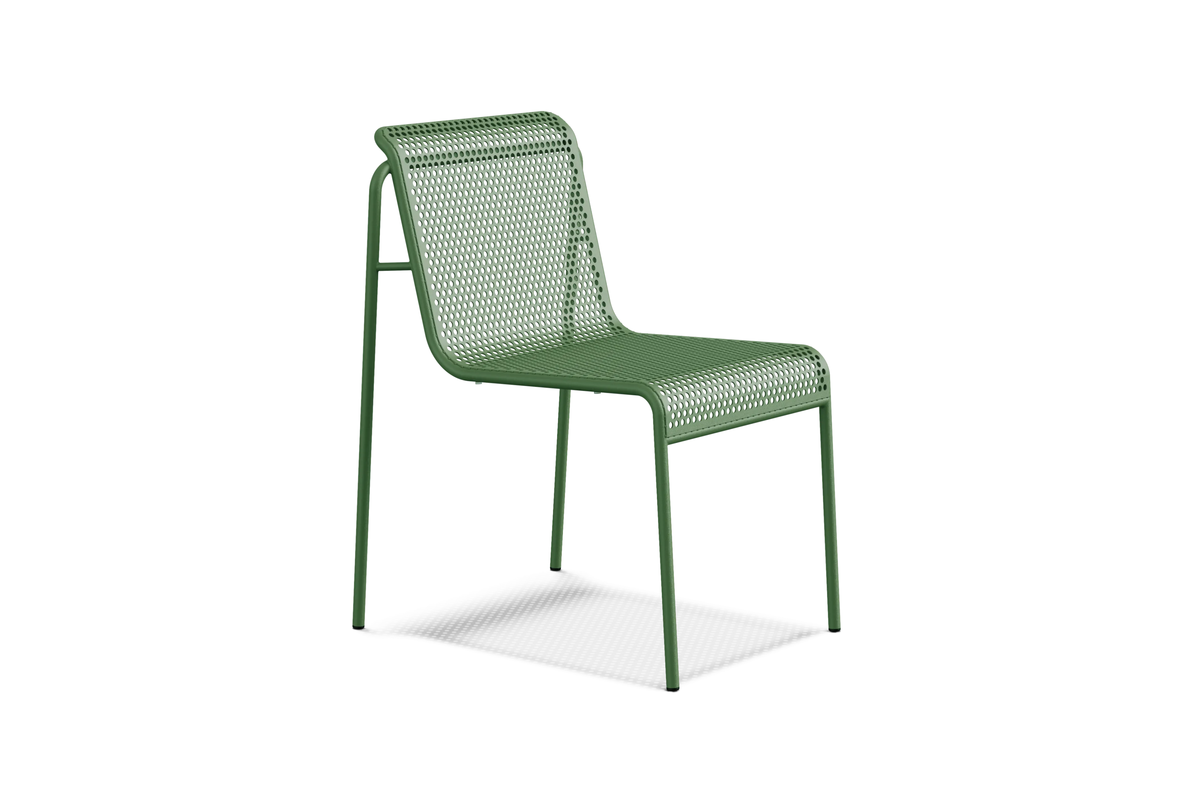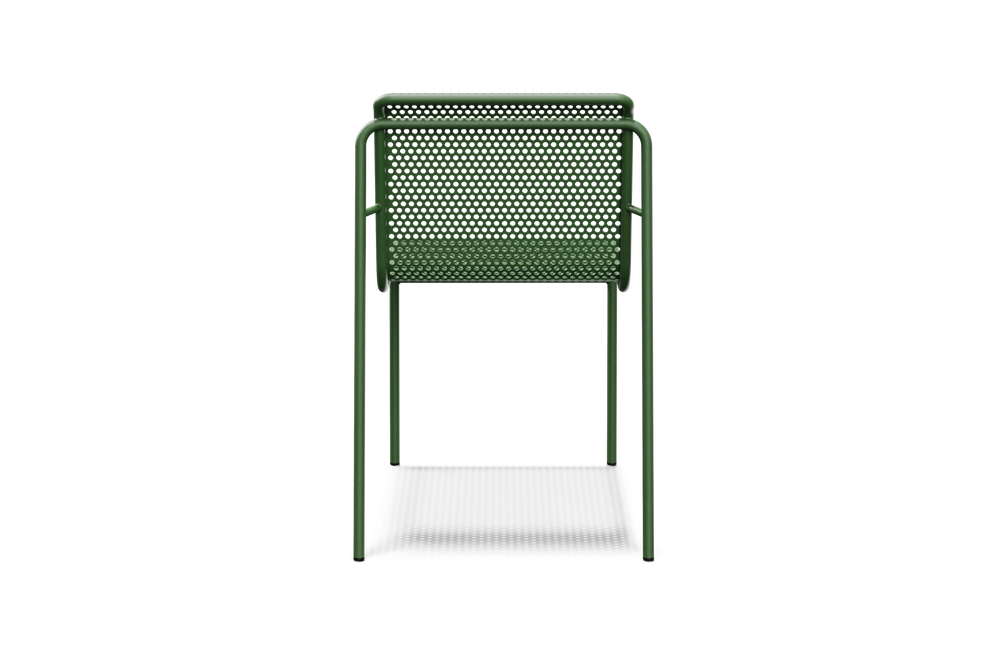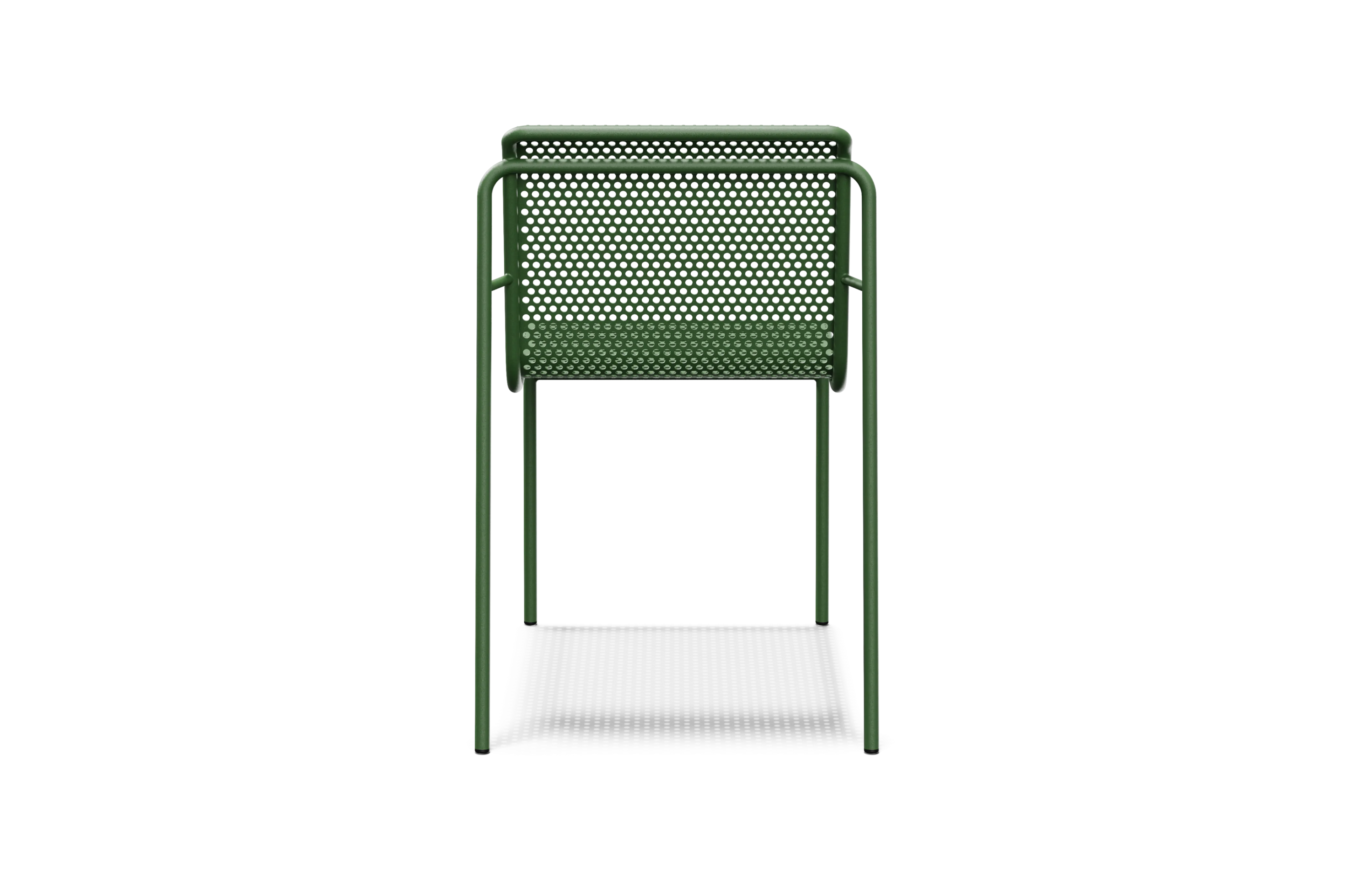 A chair reduced to its essentials: perforated surfaces, softened structure, and nothing extraneous. Stackable. Durable. Designed to hold its own place at the table.