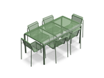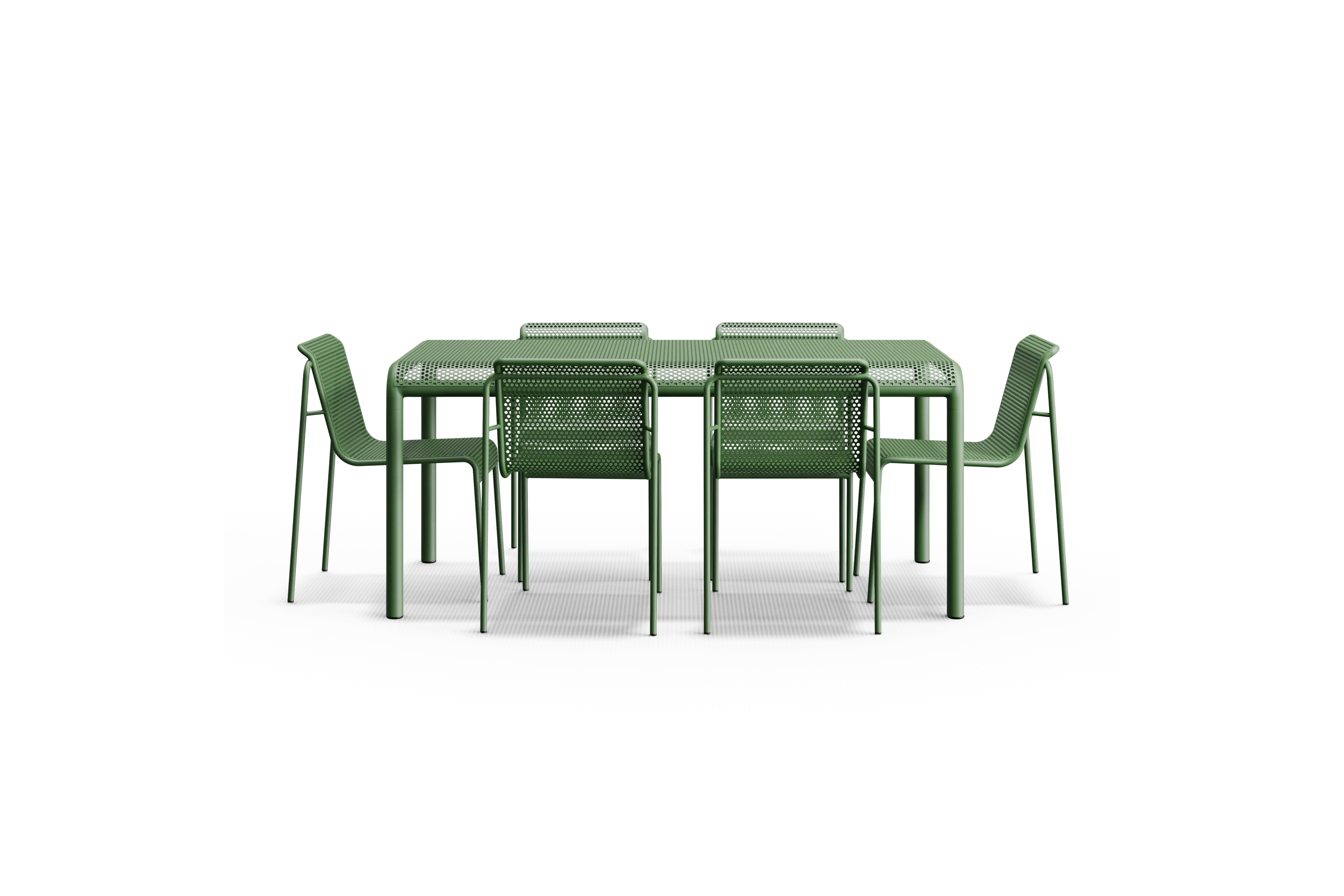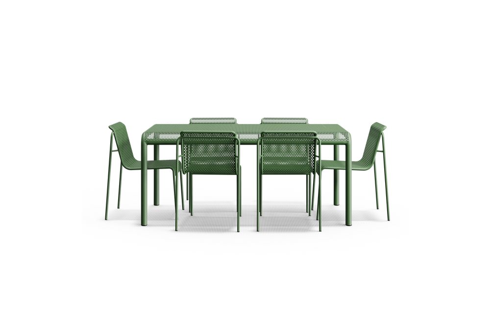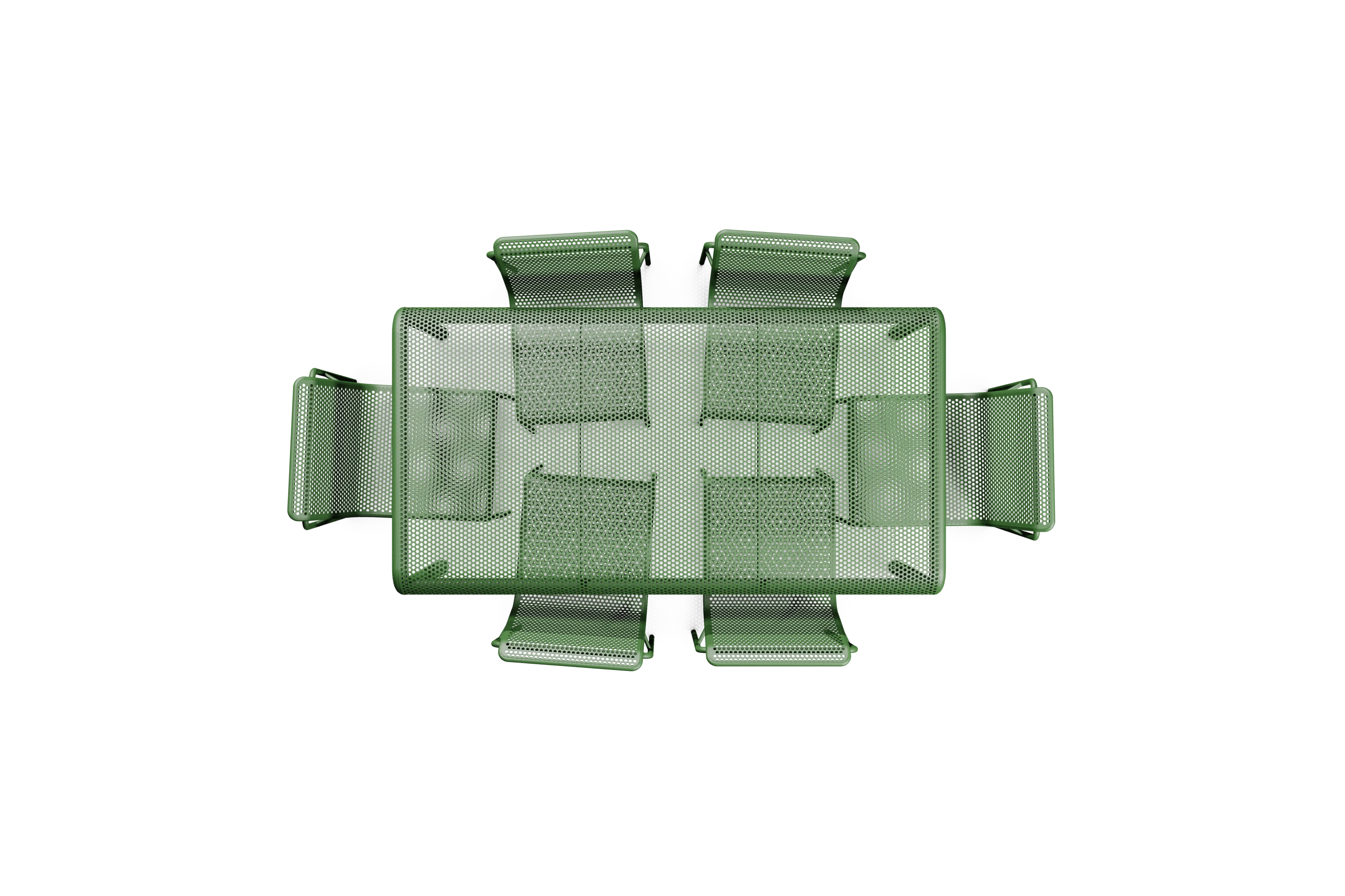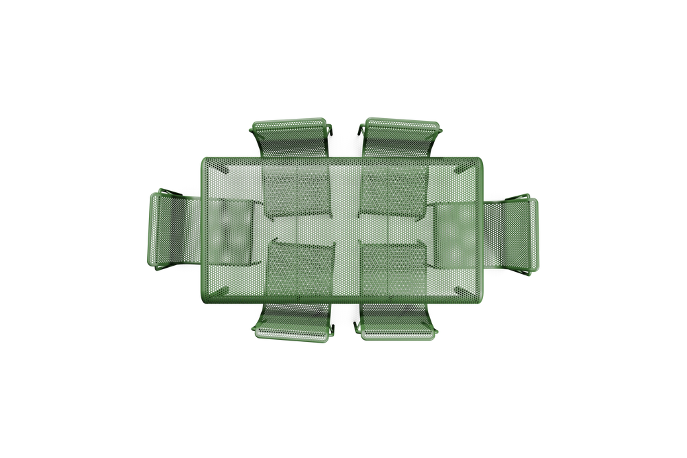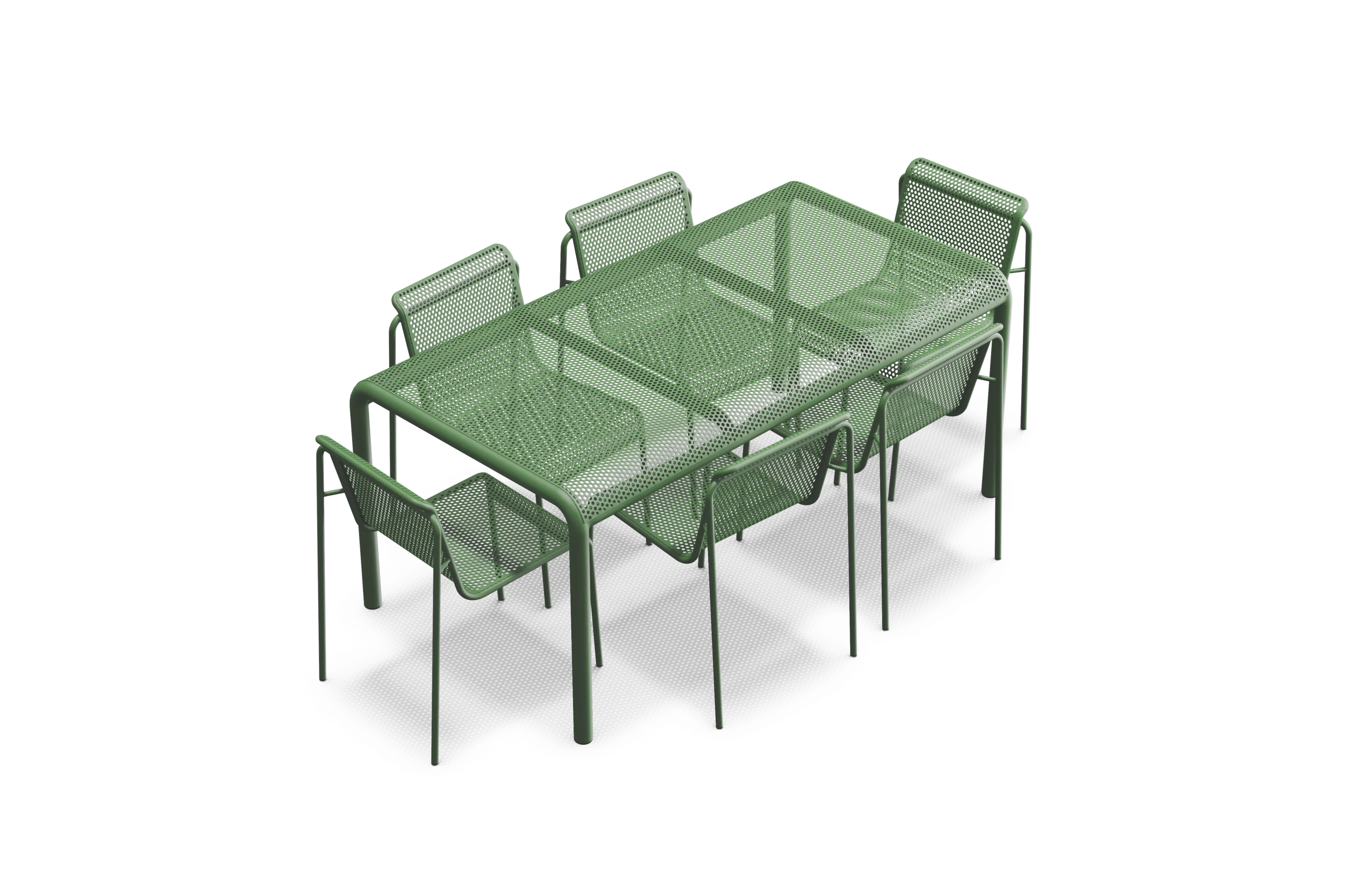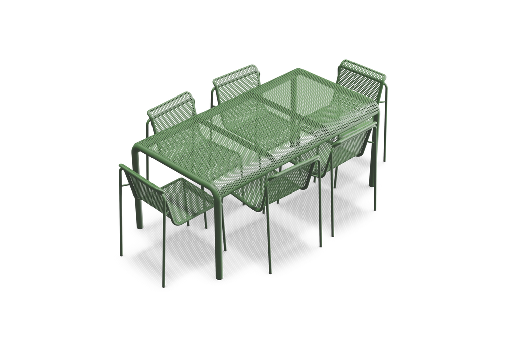 Serious about design, casual about everything else. The Perf Dining Set makes space for everyday gatherings and bold statements — no cushions, no fuss, just good design (and chairs) that stack up.