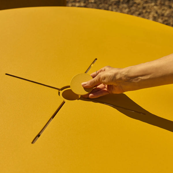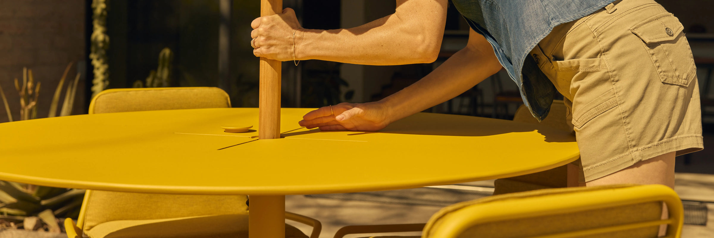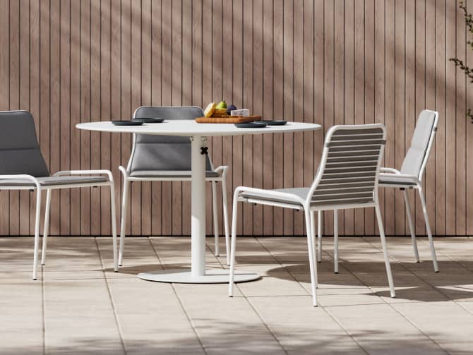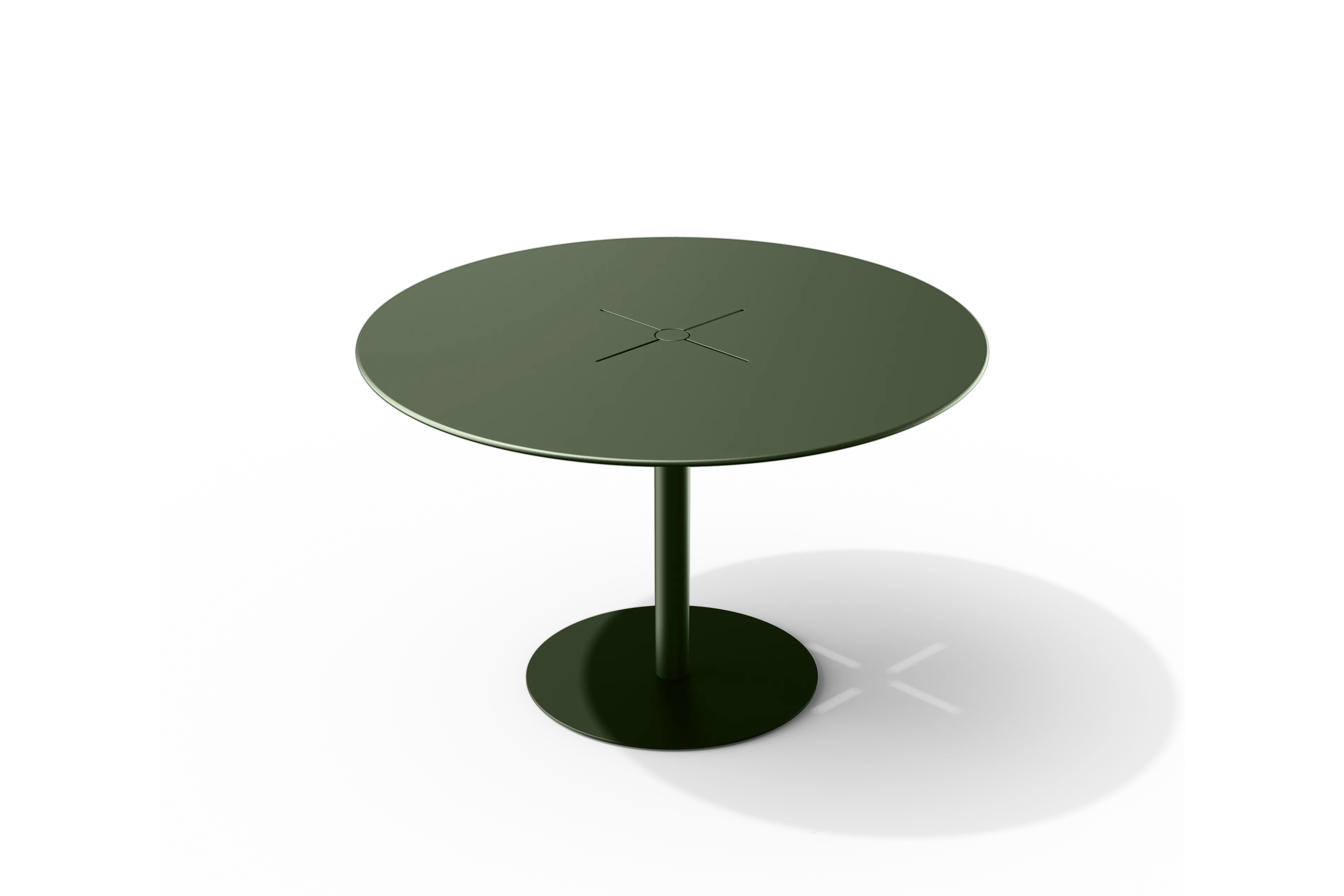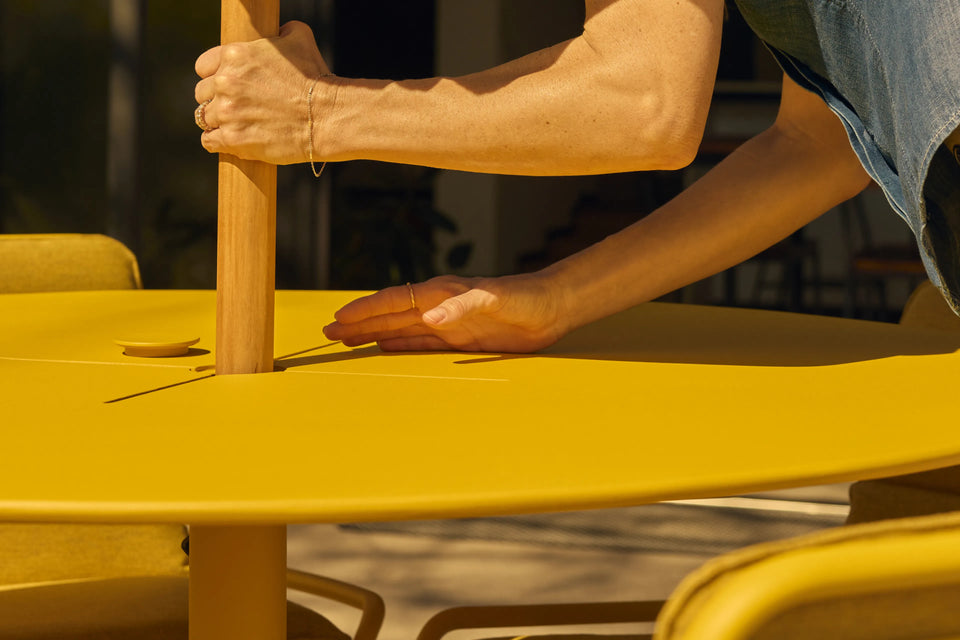 Made for good meals and good company, the XY Dining Table features a powder-coated metal base that’s perfect for all weather and doubles as a hidden umbrella base.