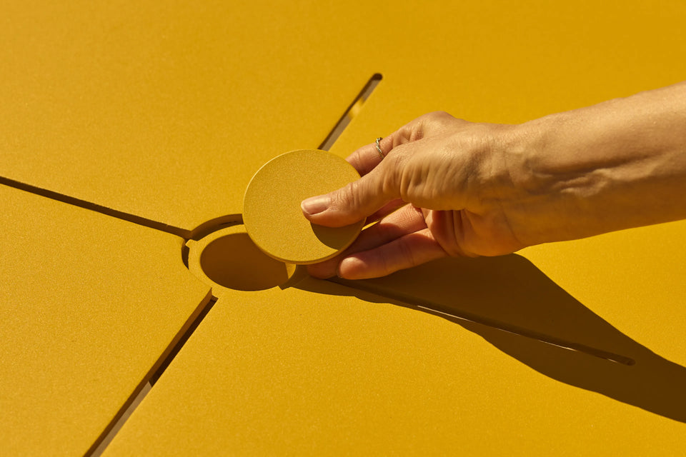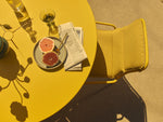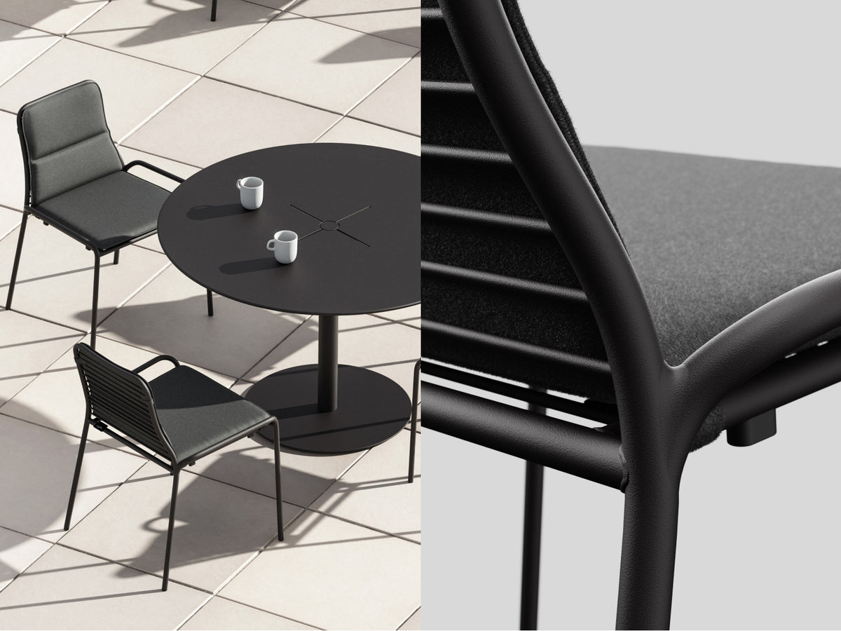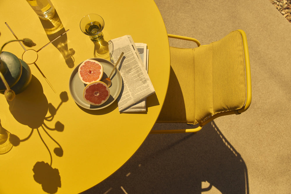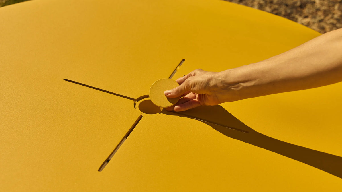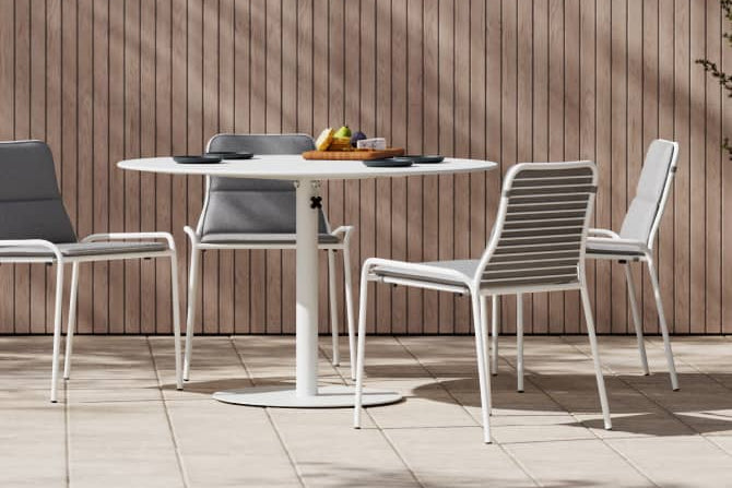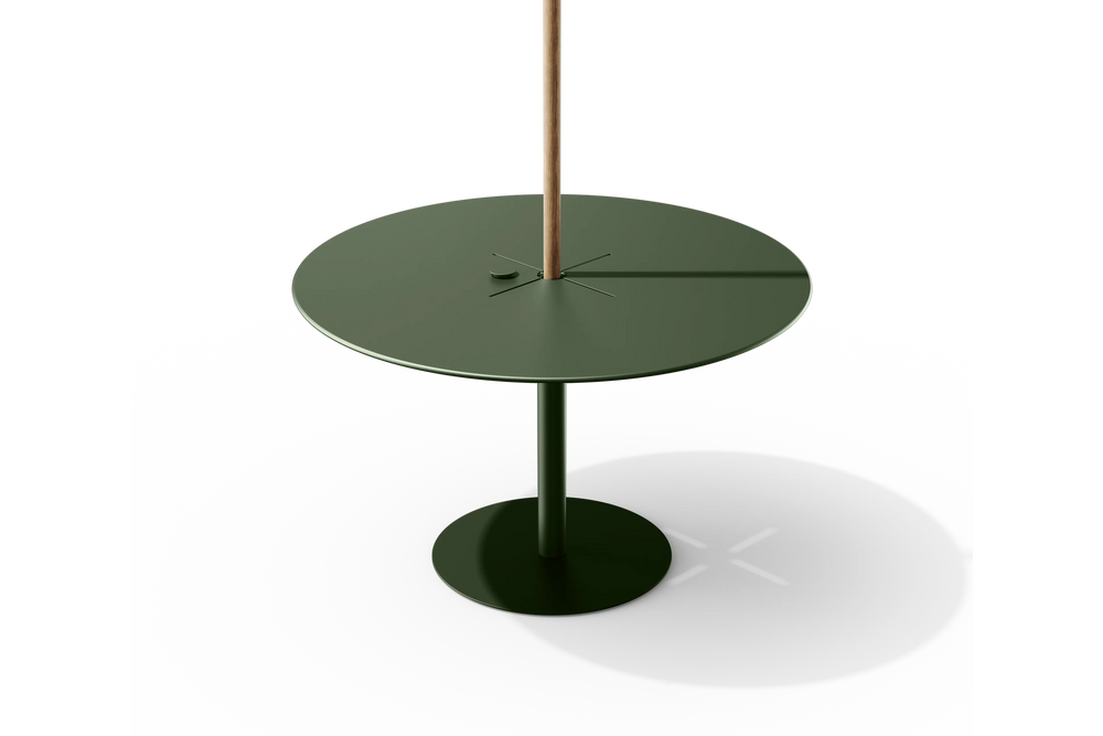 Made for good meals and good company, the XY Dining Table features a powder-coated metal base that’s perfect for all weather and doubles as a hidden umbrella base.
