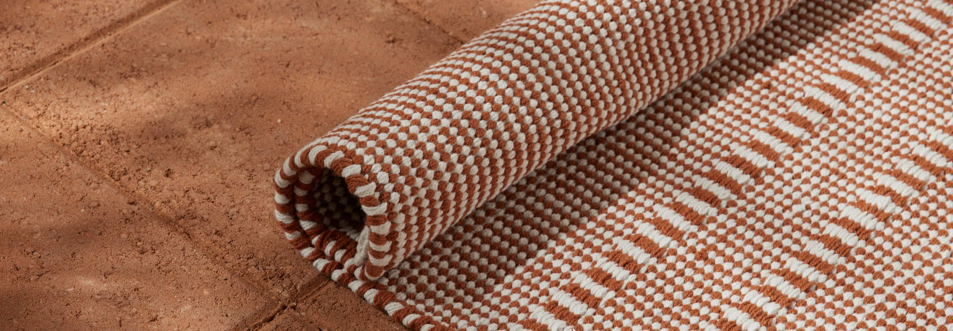 Our Field Rug, Dune Rug, and Mesa Rug should be brought indoors or placed under a cover when it rains. Our rugs made with Sunbrella® or recycled polyester can withstand all weather conditions.