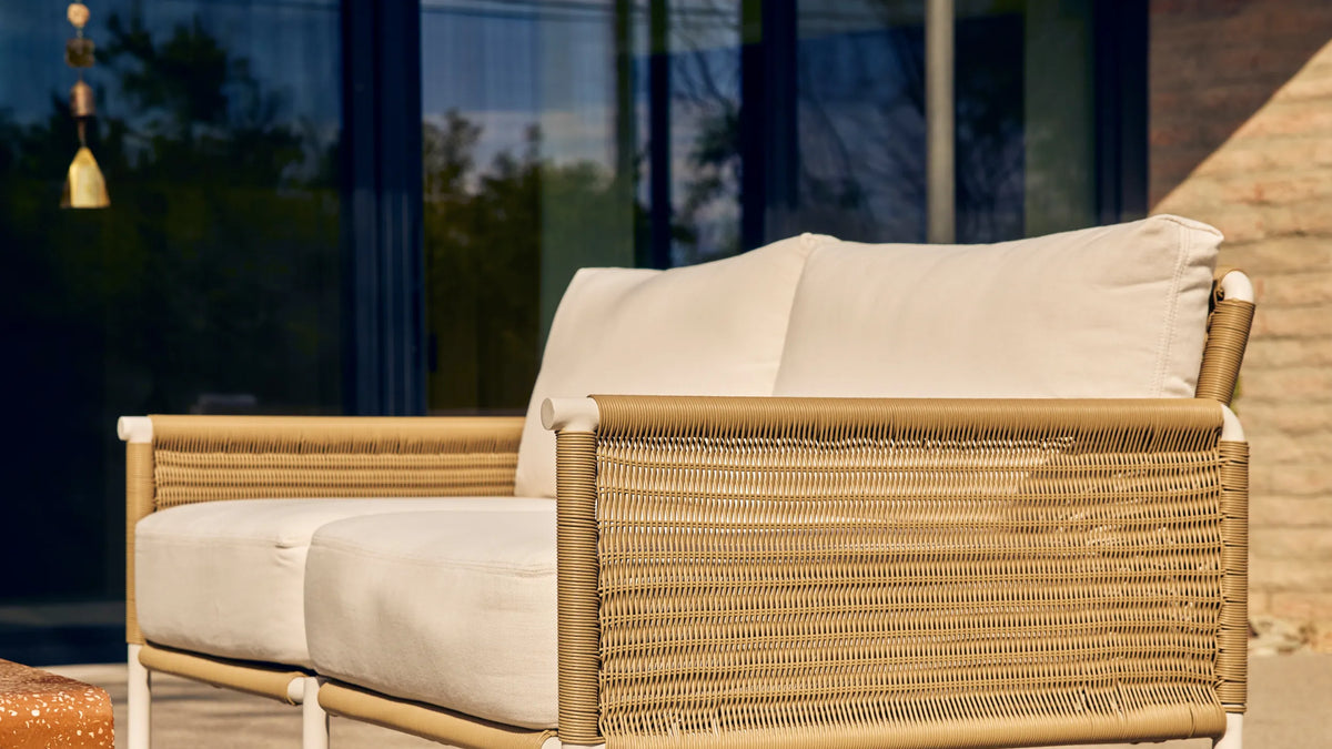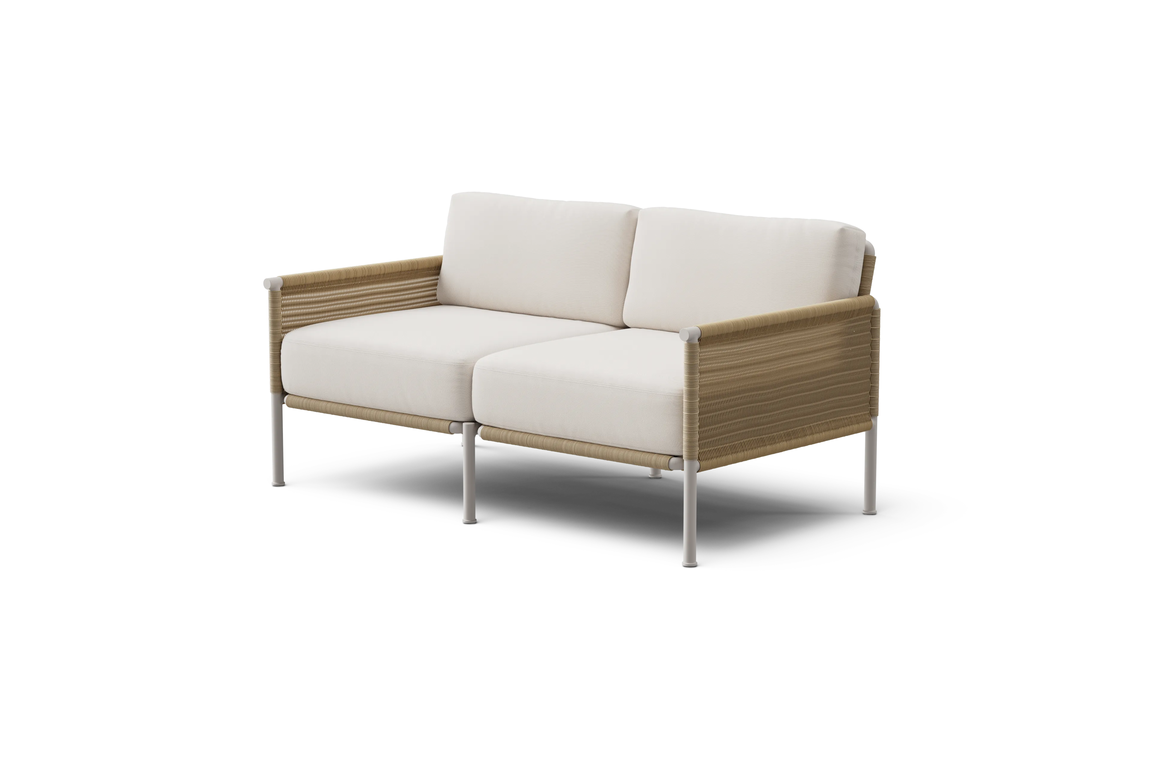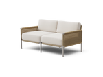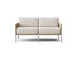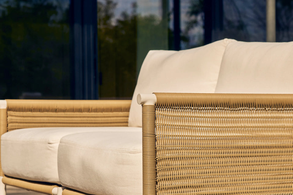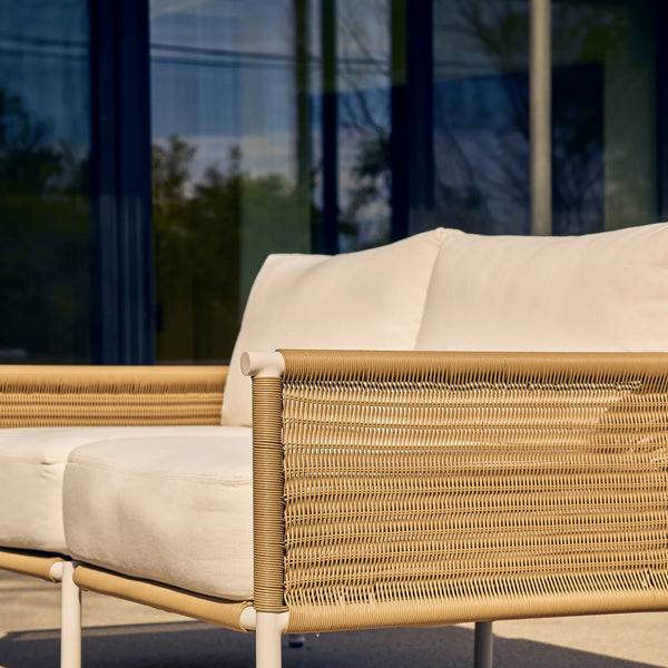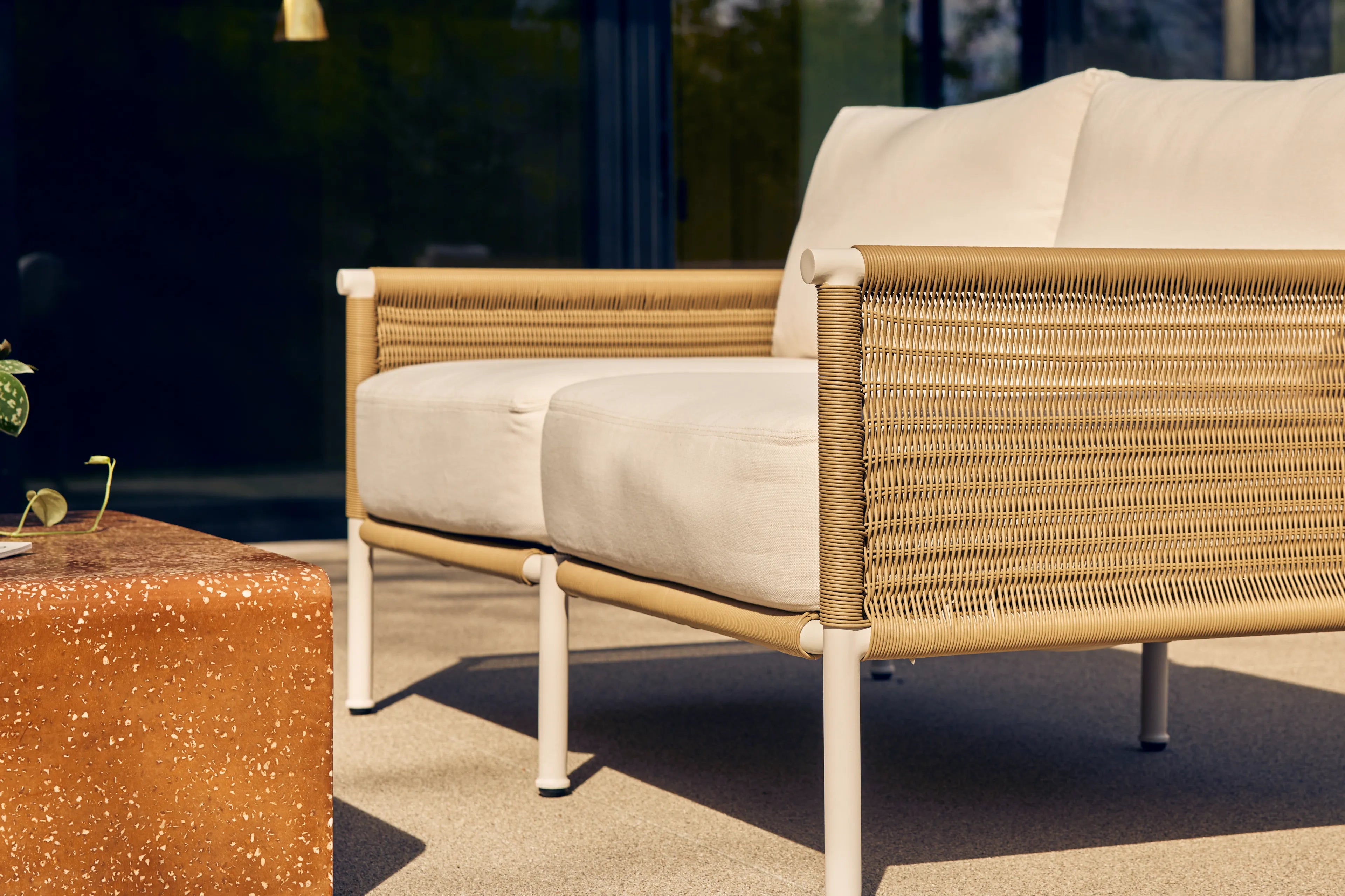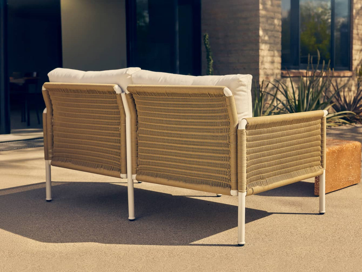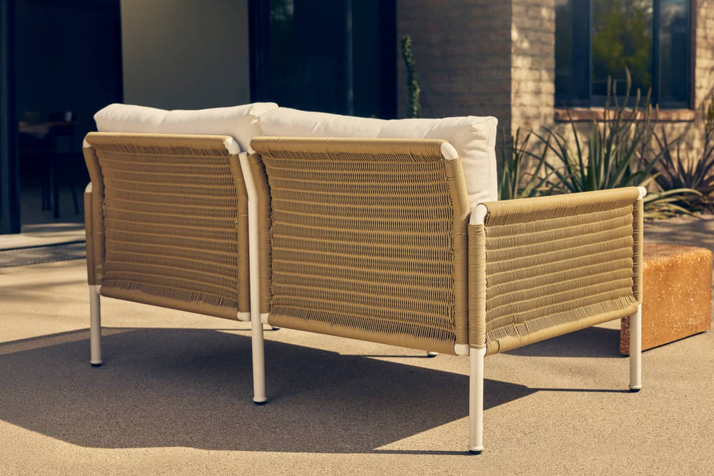 Small footprint, big presence. The Camber Loveseat blends a sleek aluminum frame with woven warmth and soft, weatherproof cushions — made for two, or just you and a good book.