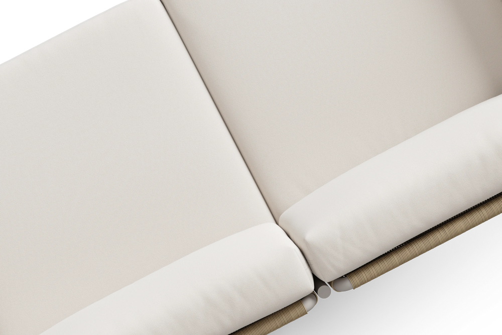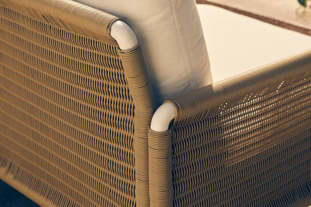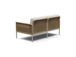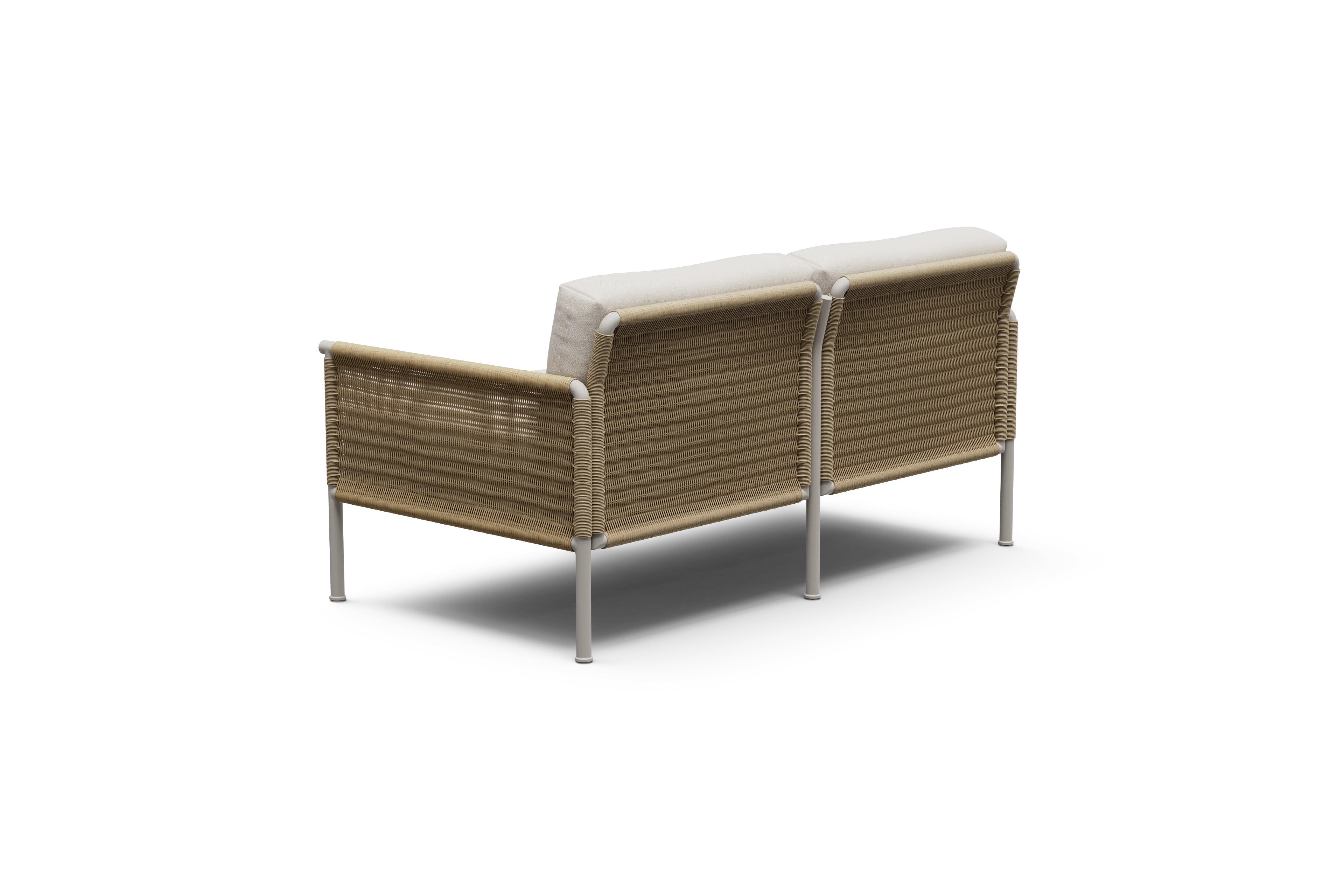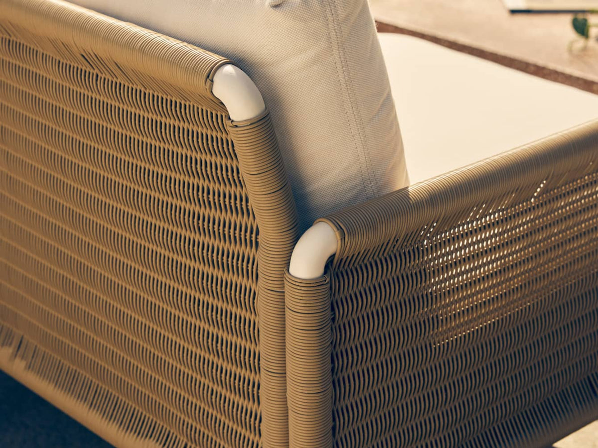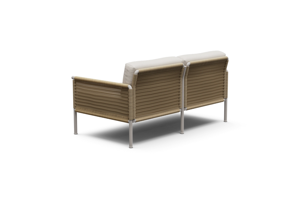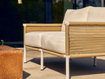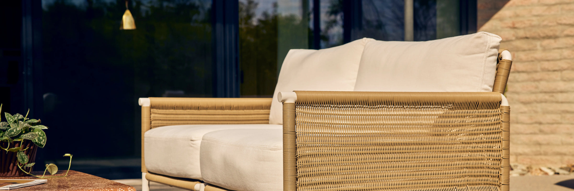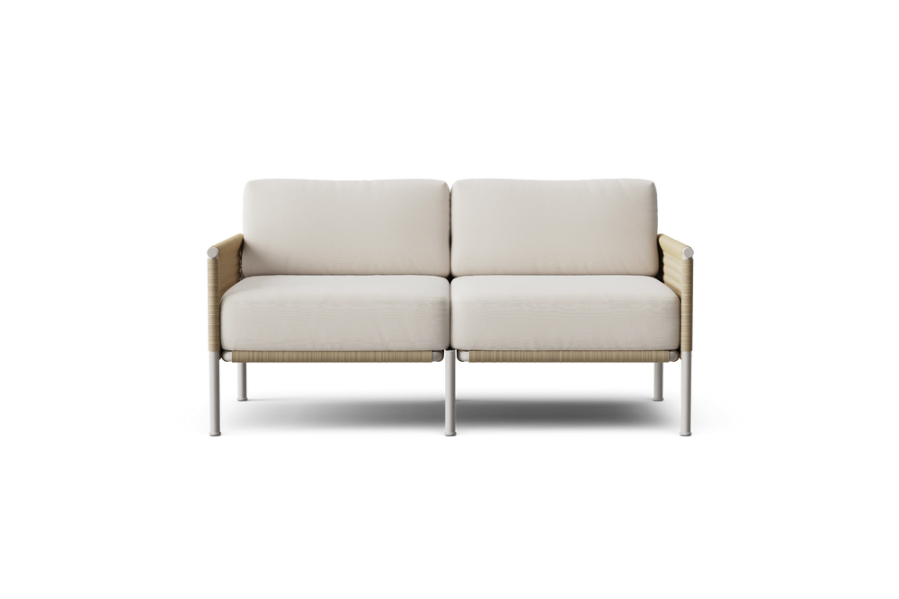 Small footprint, big presence. The Camber Loveseat blends a sleek aluminum frame with woven warmth and soft, weatherproof cushions — made for two, or just you and a good book.