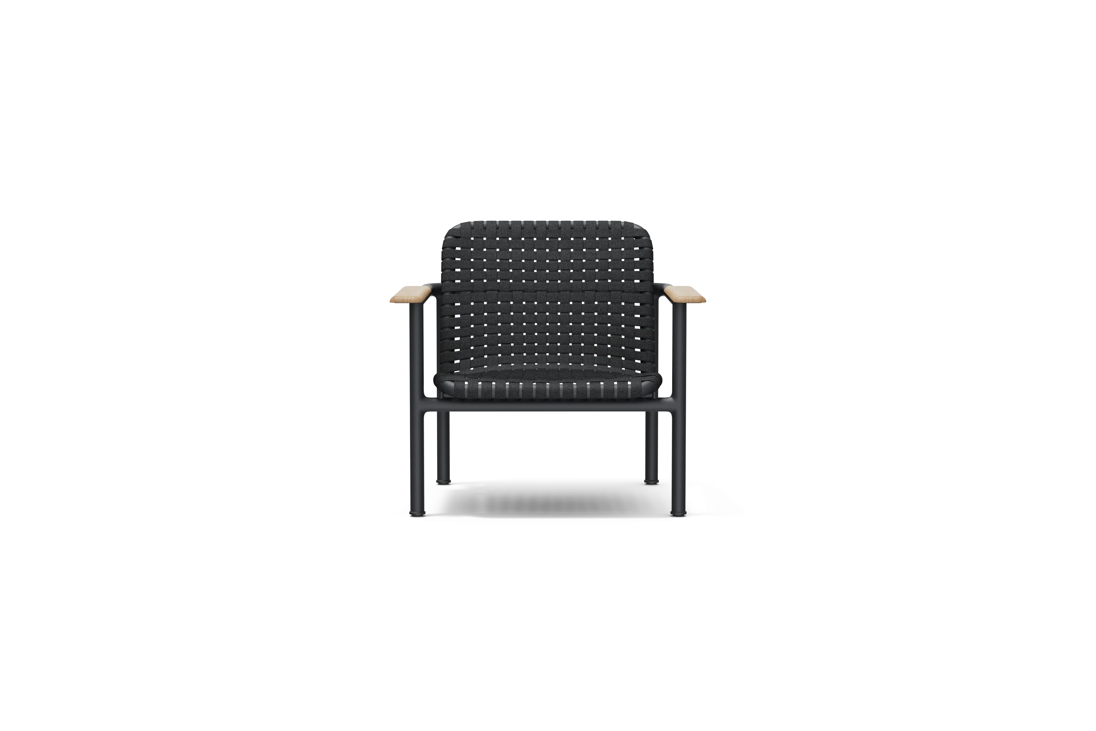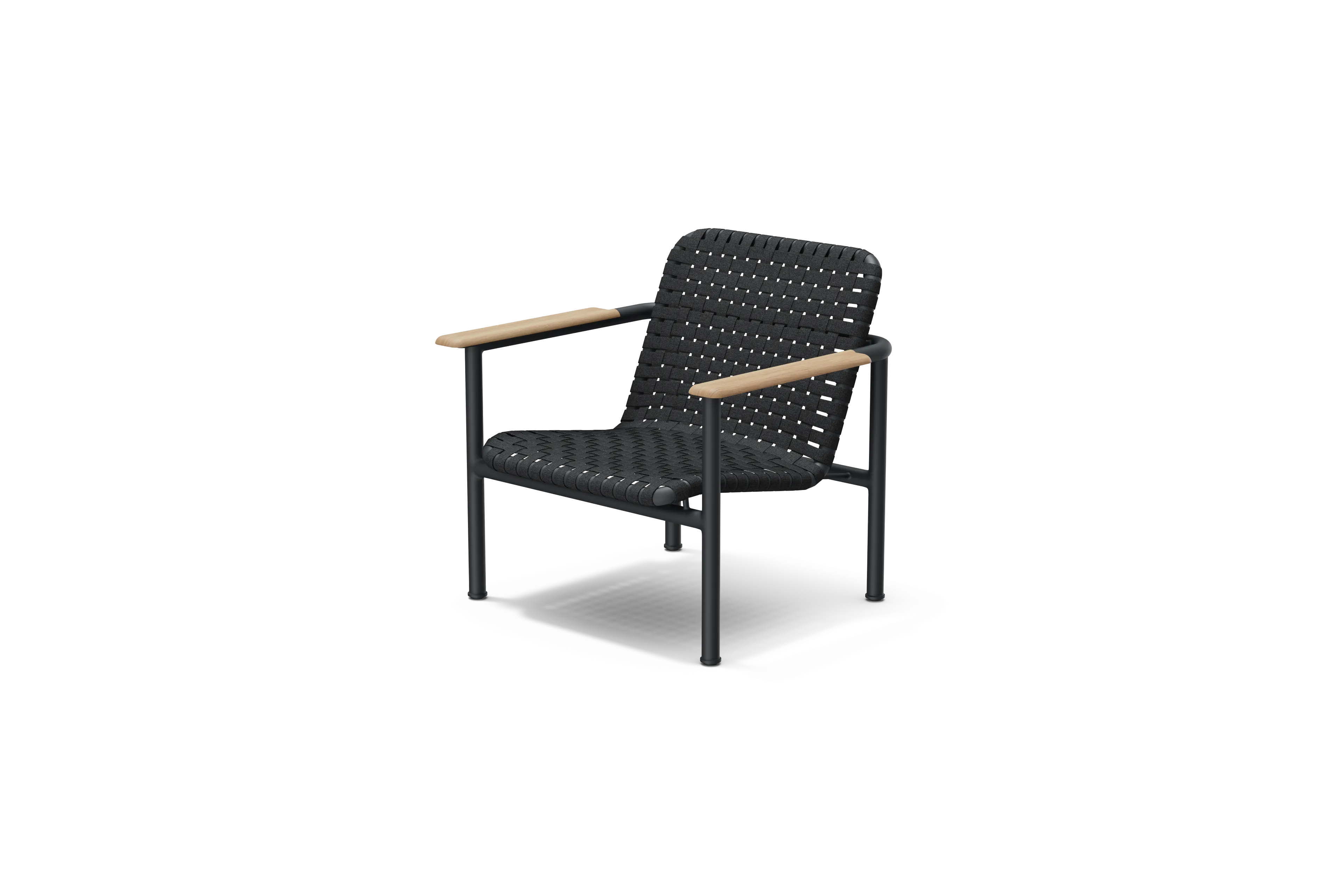 Powder-coated aluminum, woven Sunbrella® stretch strap, and solid teak armrests. Selected for durability, weather resistance, and long-term outdoor performance.