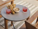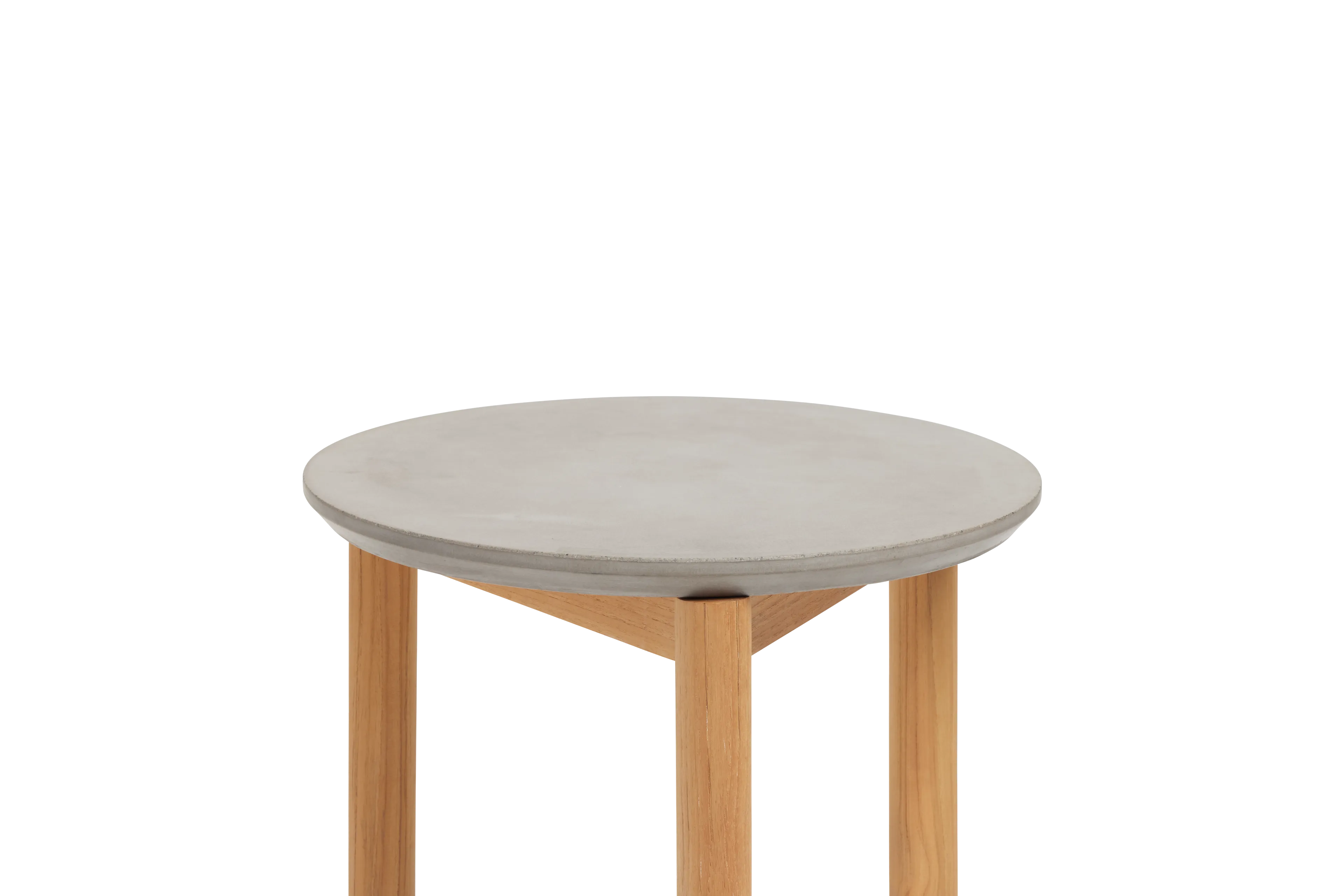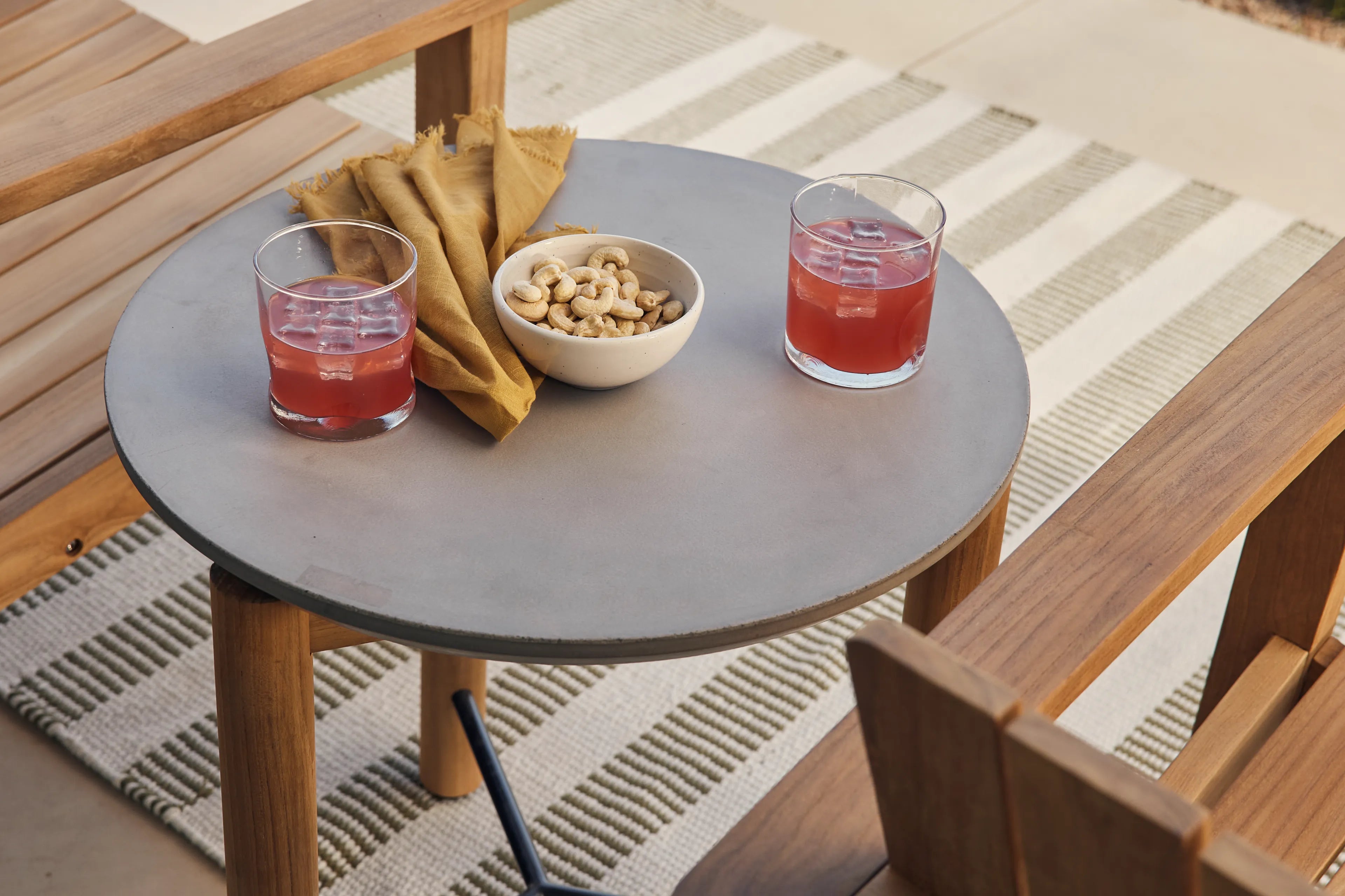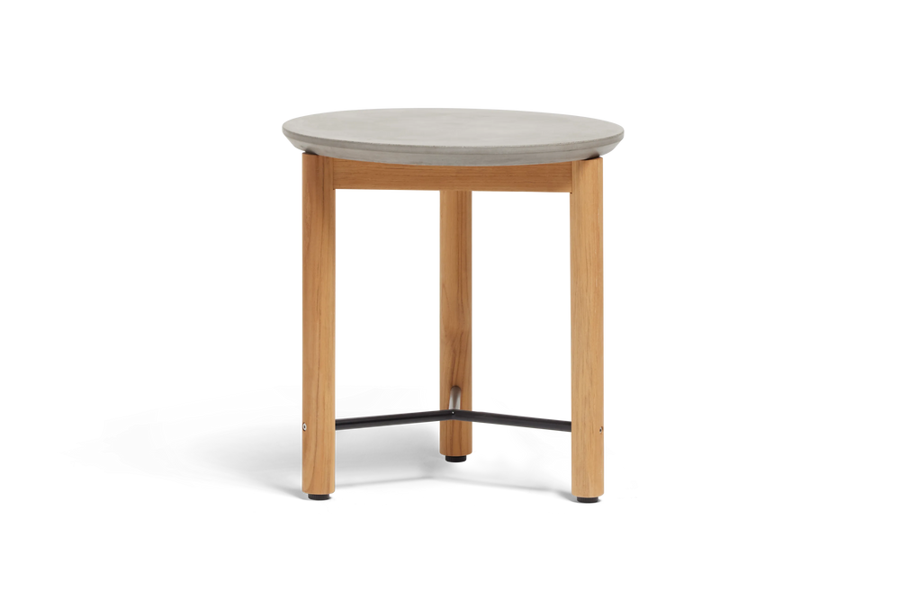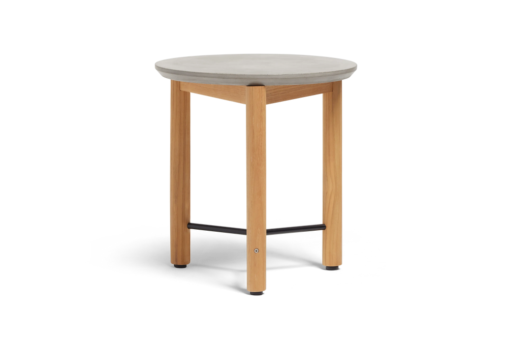 A round concrete top meets an architectural FSC-certified solid wood base. Well-proportioned from every angle and ready for outdoor lounging and entertaining. Coffee table also available.