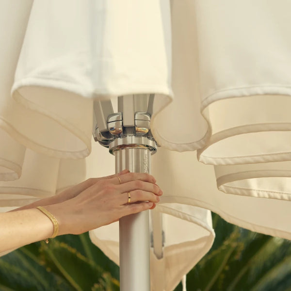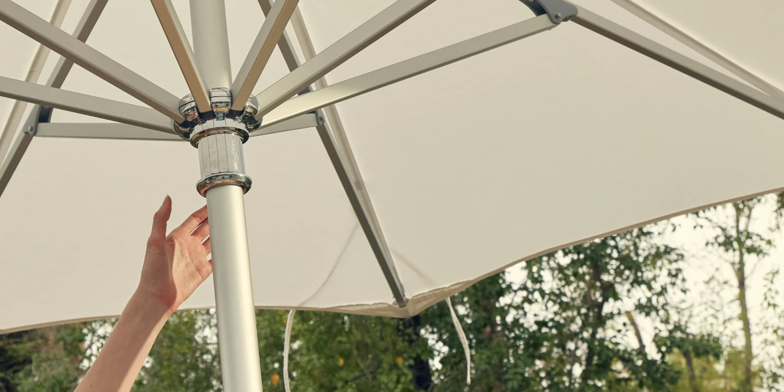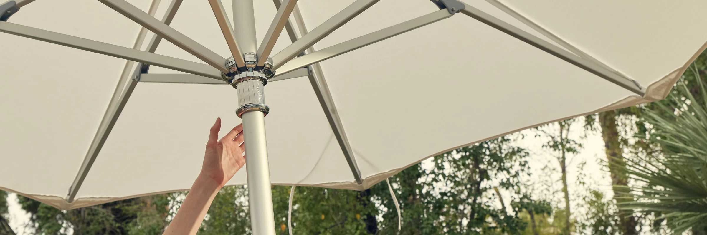 One motion. No crank, no pulley, no rope. The Cast Umbrella opens the way outdoor shade always should have.