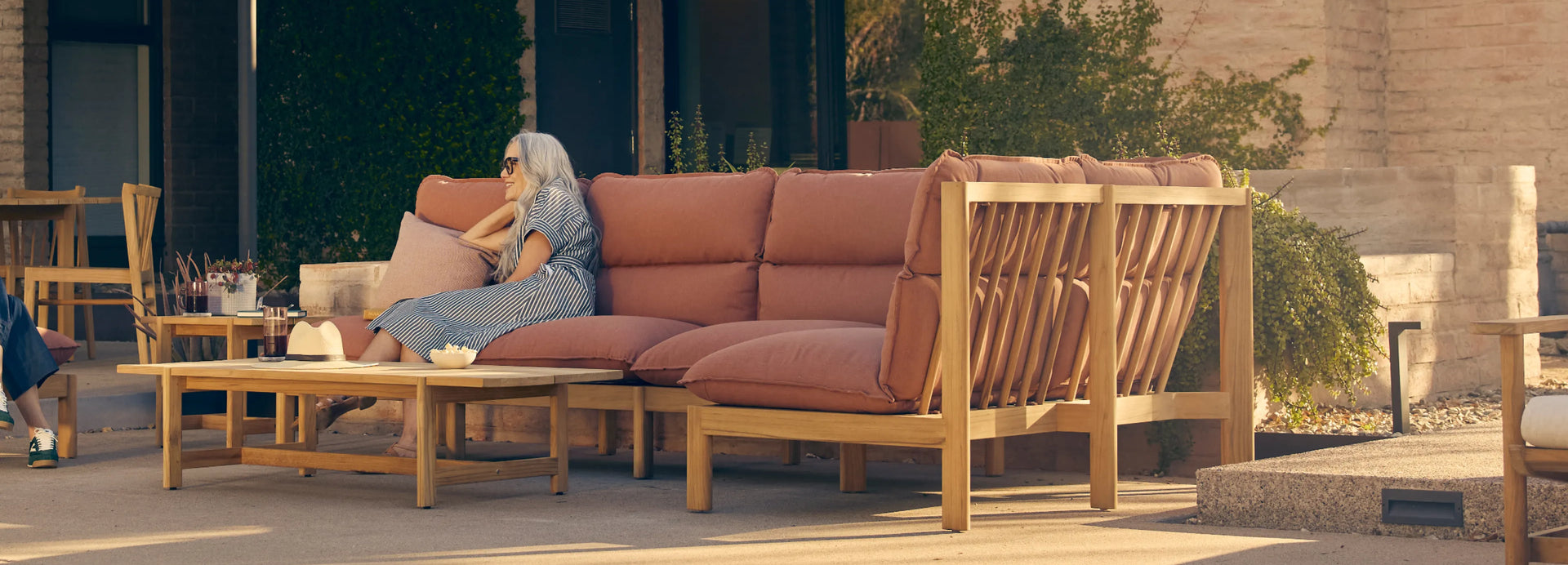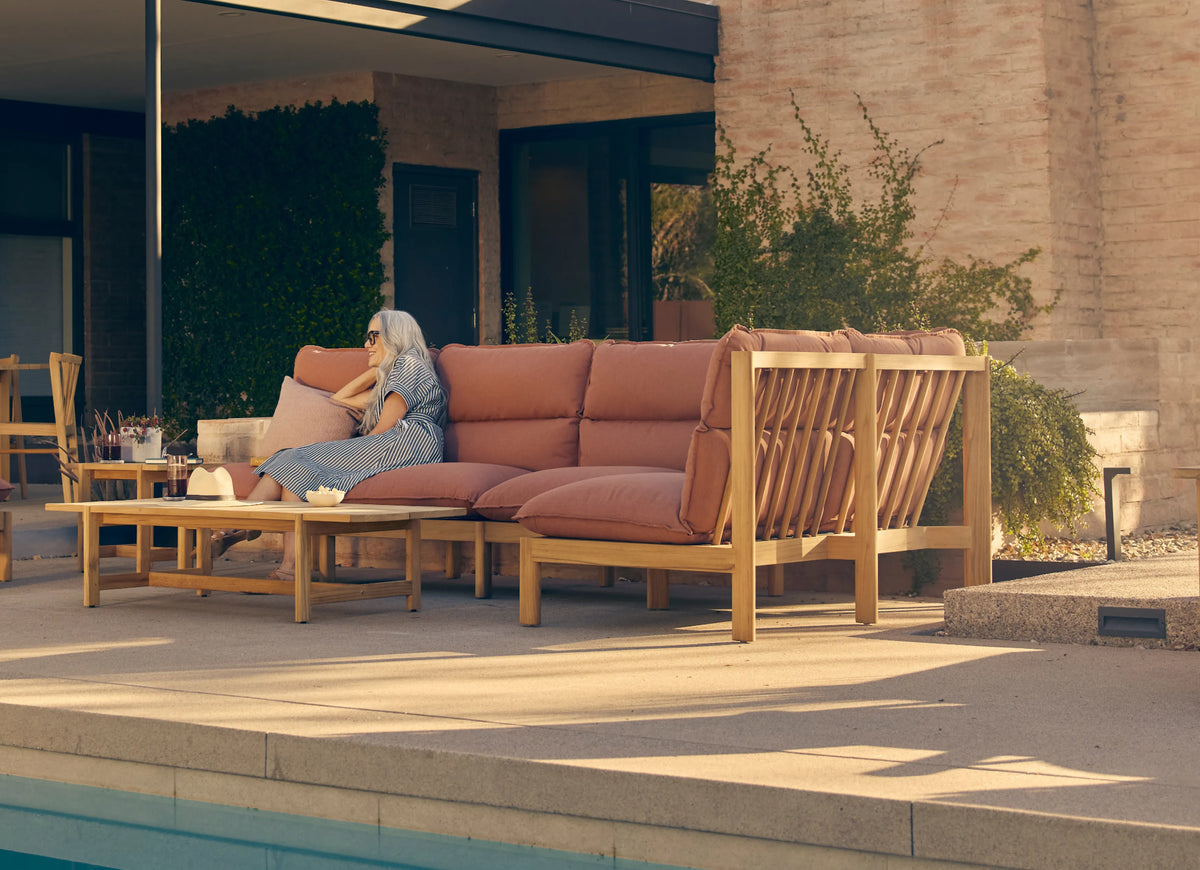 Teak has natural oils that make it weather-resistant, durable, and low-maintenance. Teak can handle wind, rain, humidity, heat, and cold. Our teak outdoor sectional can last outdoors for a lifetime with the proper care (think 75 years or more!)