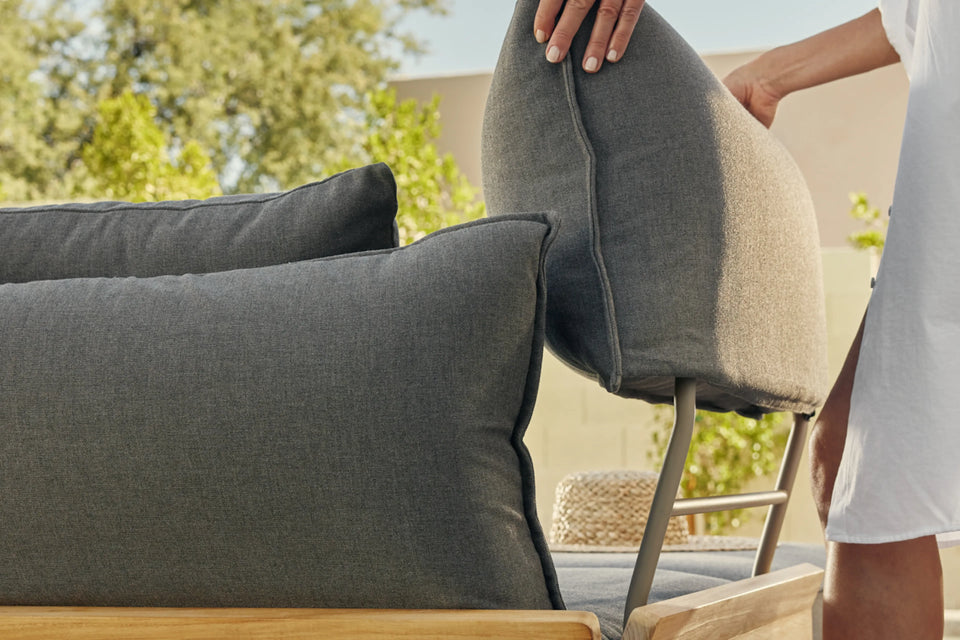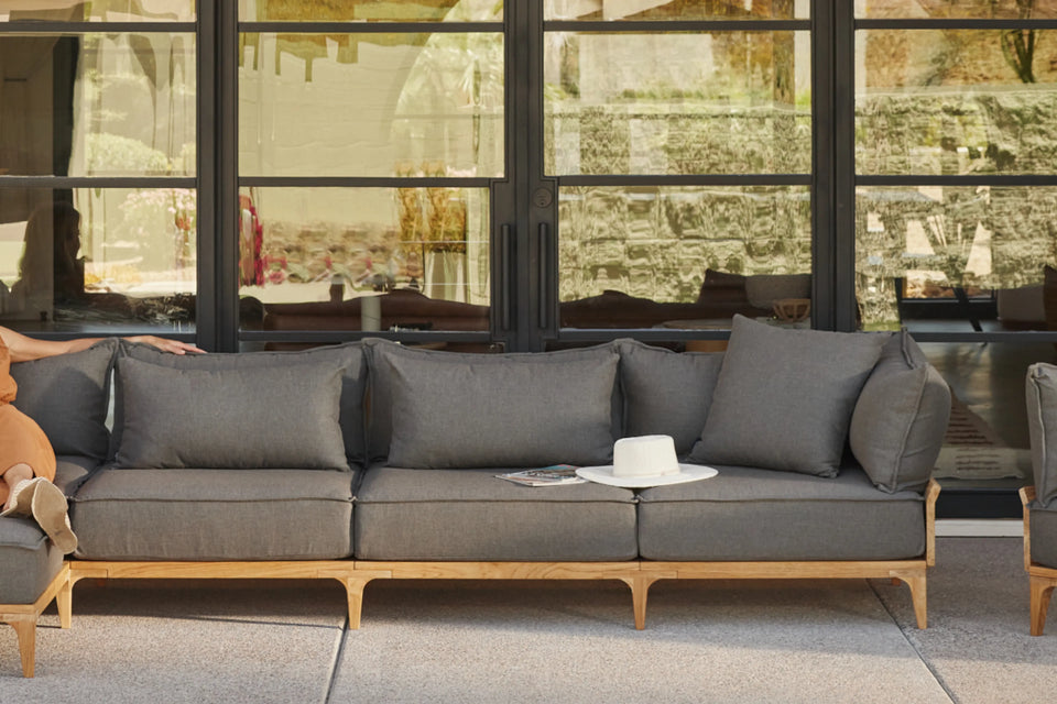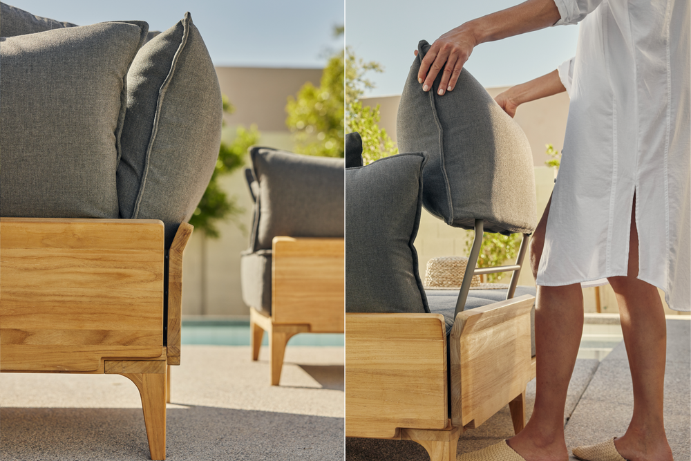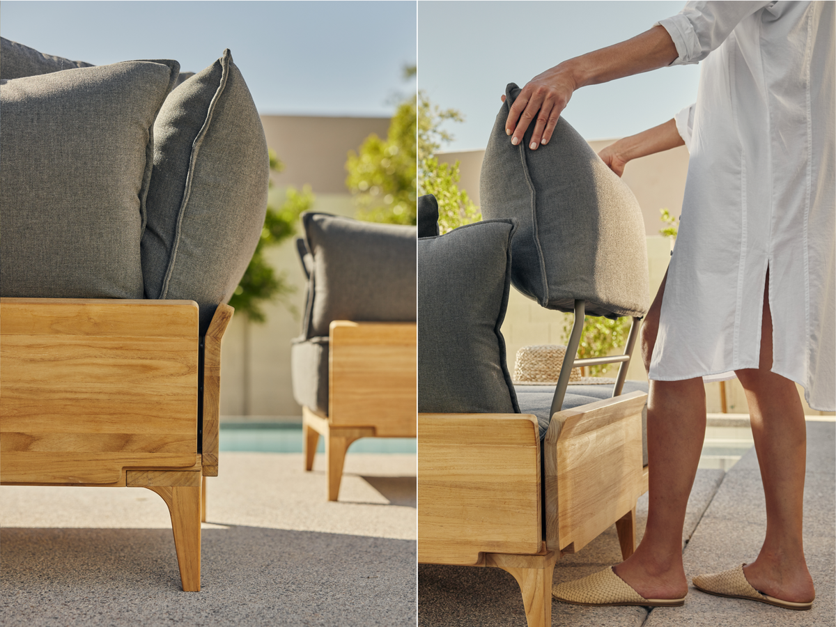 Luxurious comfort without the resort fee. The Bluff outdoor lounge collection features generously plush floating cushions, premium Sunbrella fabric and a timeless solid SVLK-certified teak frame.