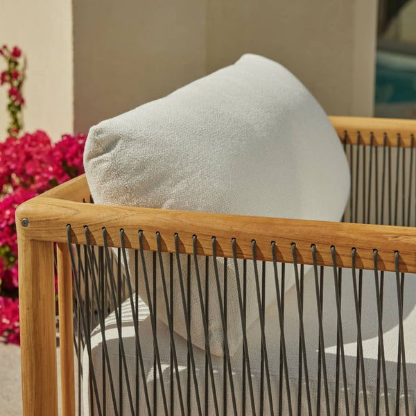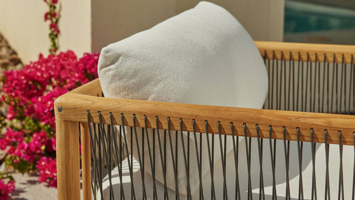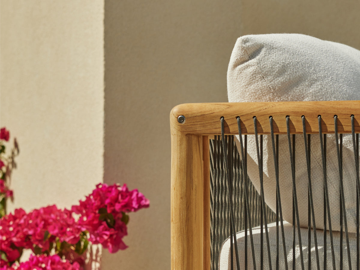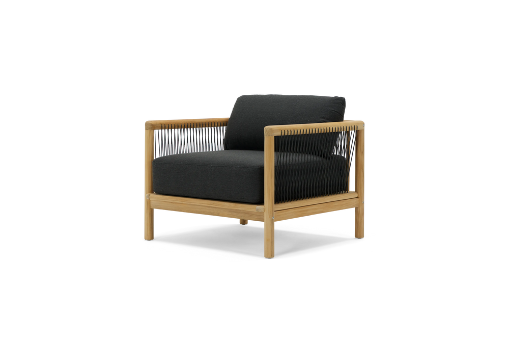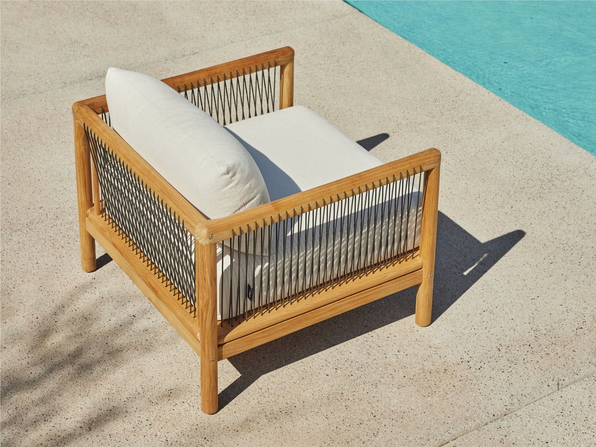 Your living room chair is jealous. The Reel chair explores artisan-style teak craftsmanship and rope details with the comfort and all-weather performance of premium Sunbrella fabric.