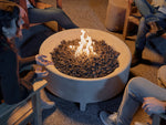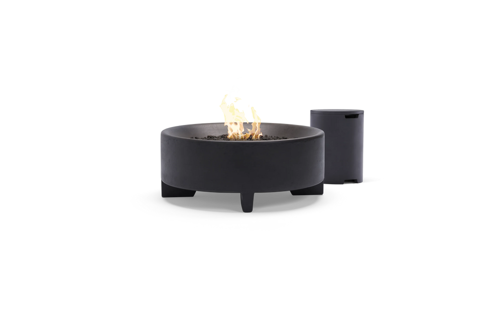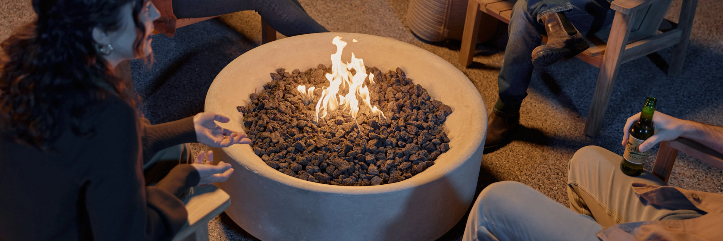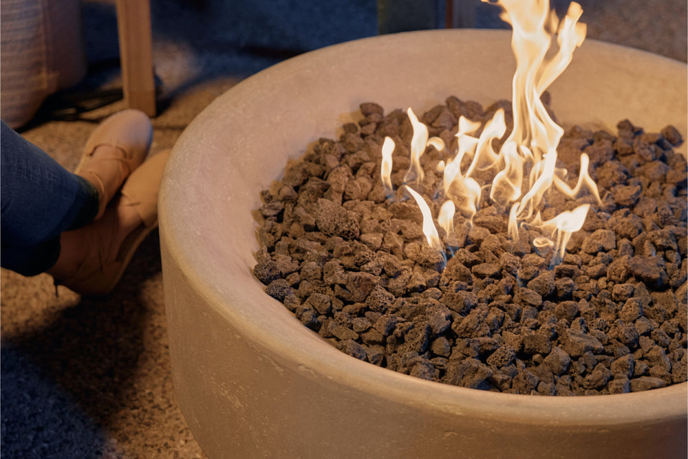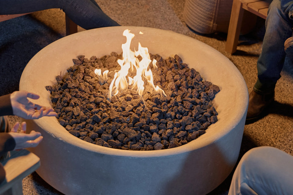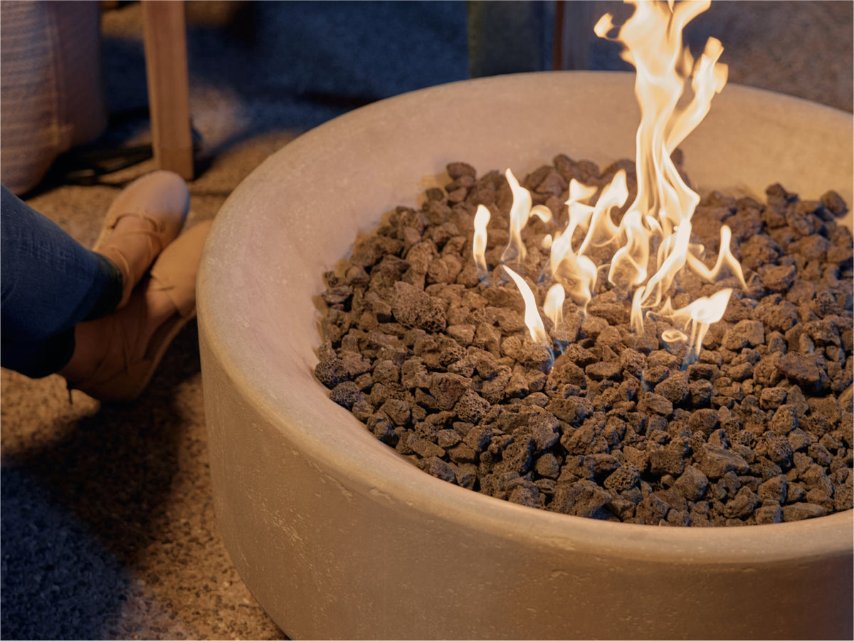 Warm up your outdoor space with our Rook fire table. Crafted of durable cast concrete in three natural finishes. Doubles as a coffee table for year-round lounging.