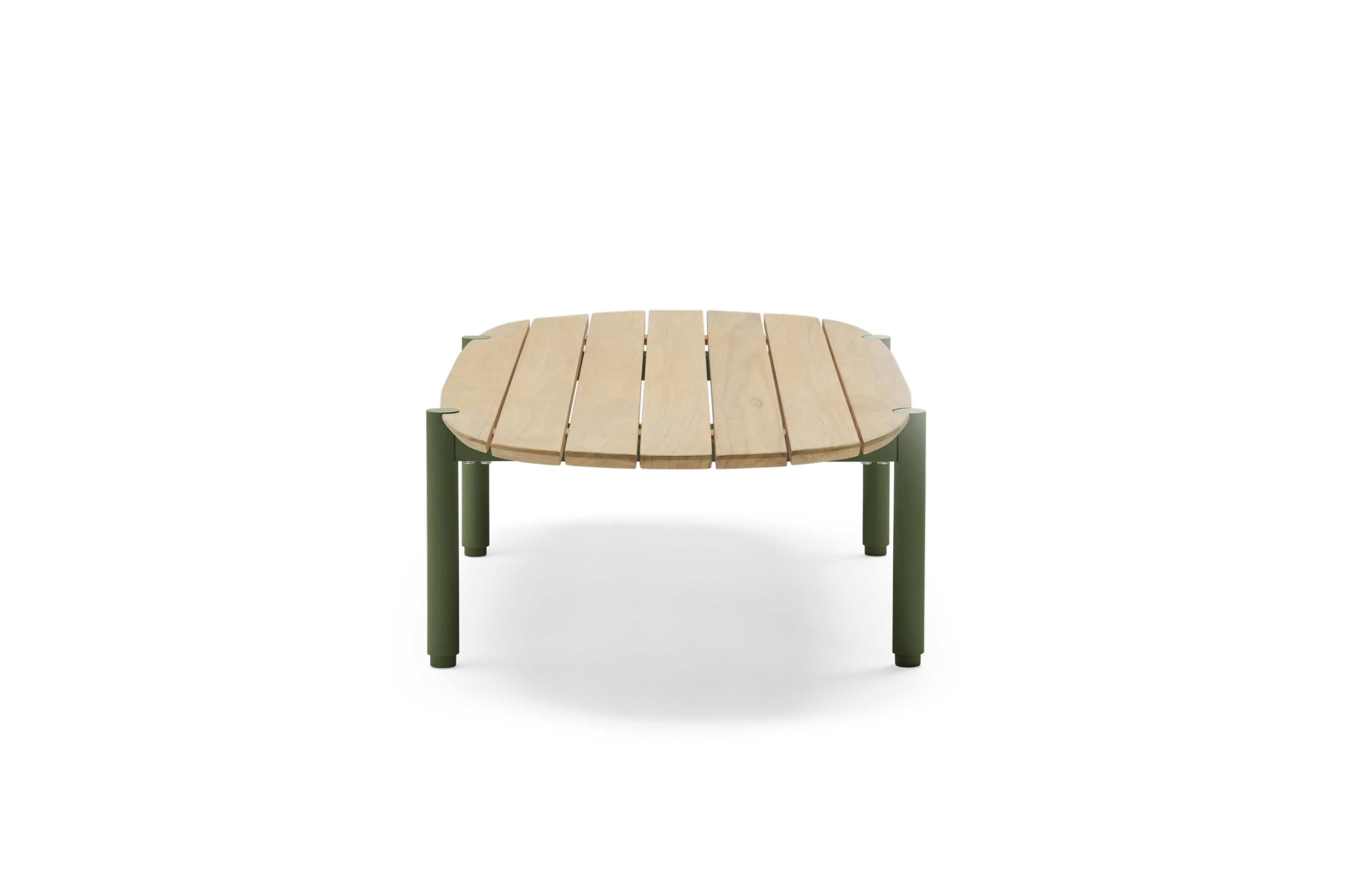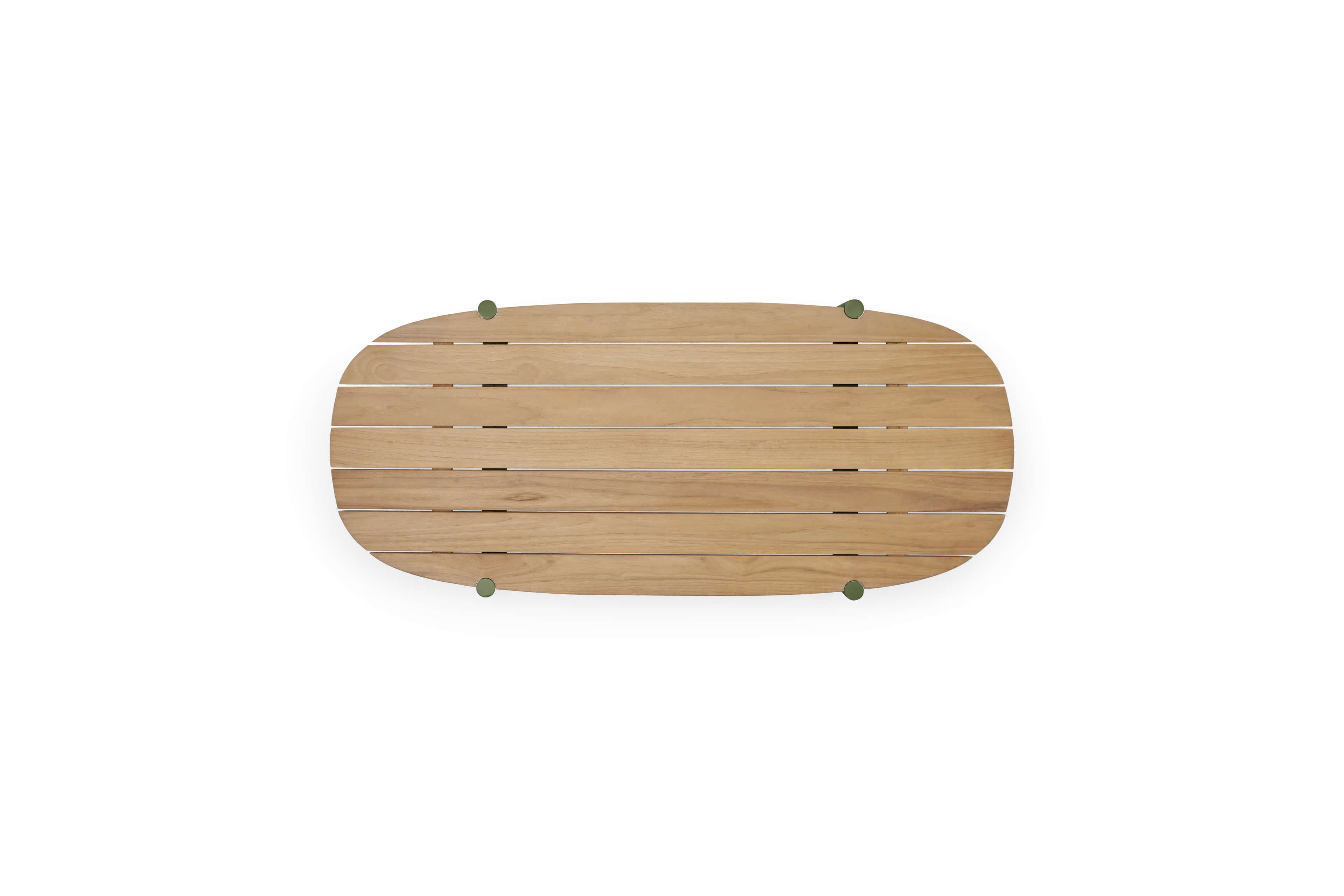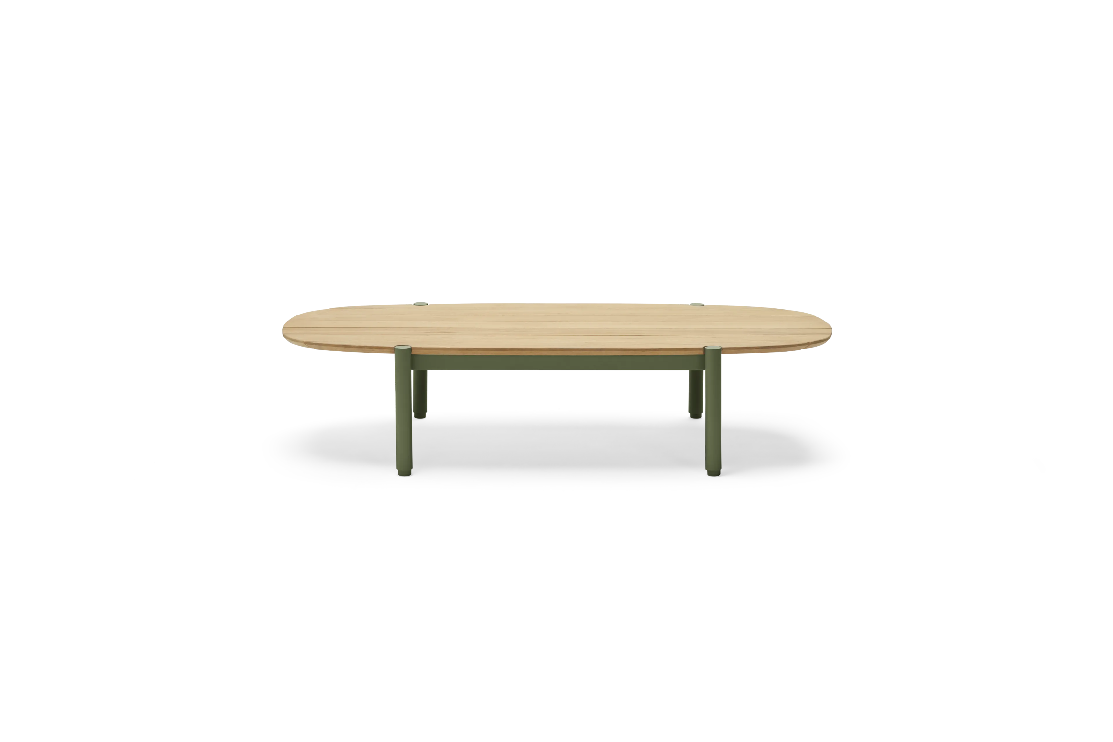 Long and lean, this eye-catching coffee table brings together crafted solid wood and durable matte aluminum.